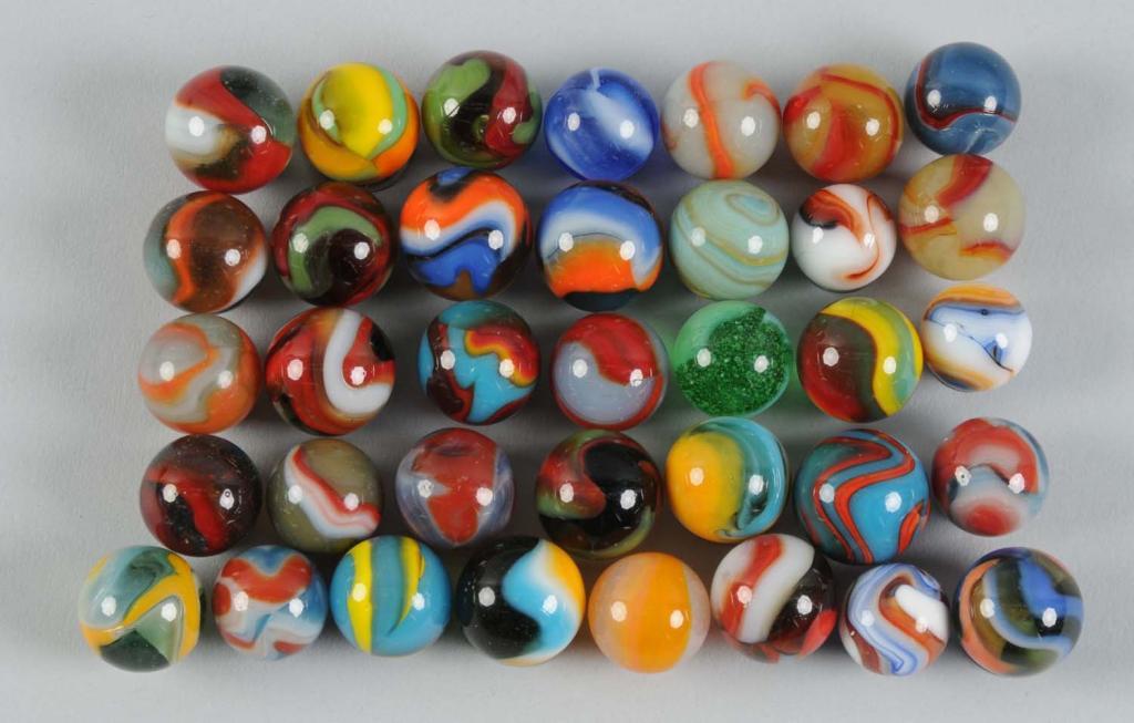 Includes approximately 36 marbles with at least two Peltier examples. Condition (9.7+). Size Largest: 23/16" Dia.