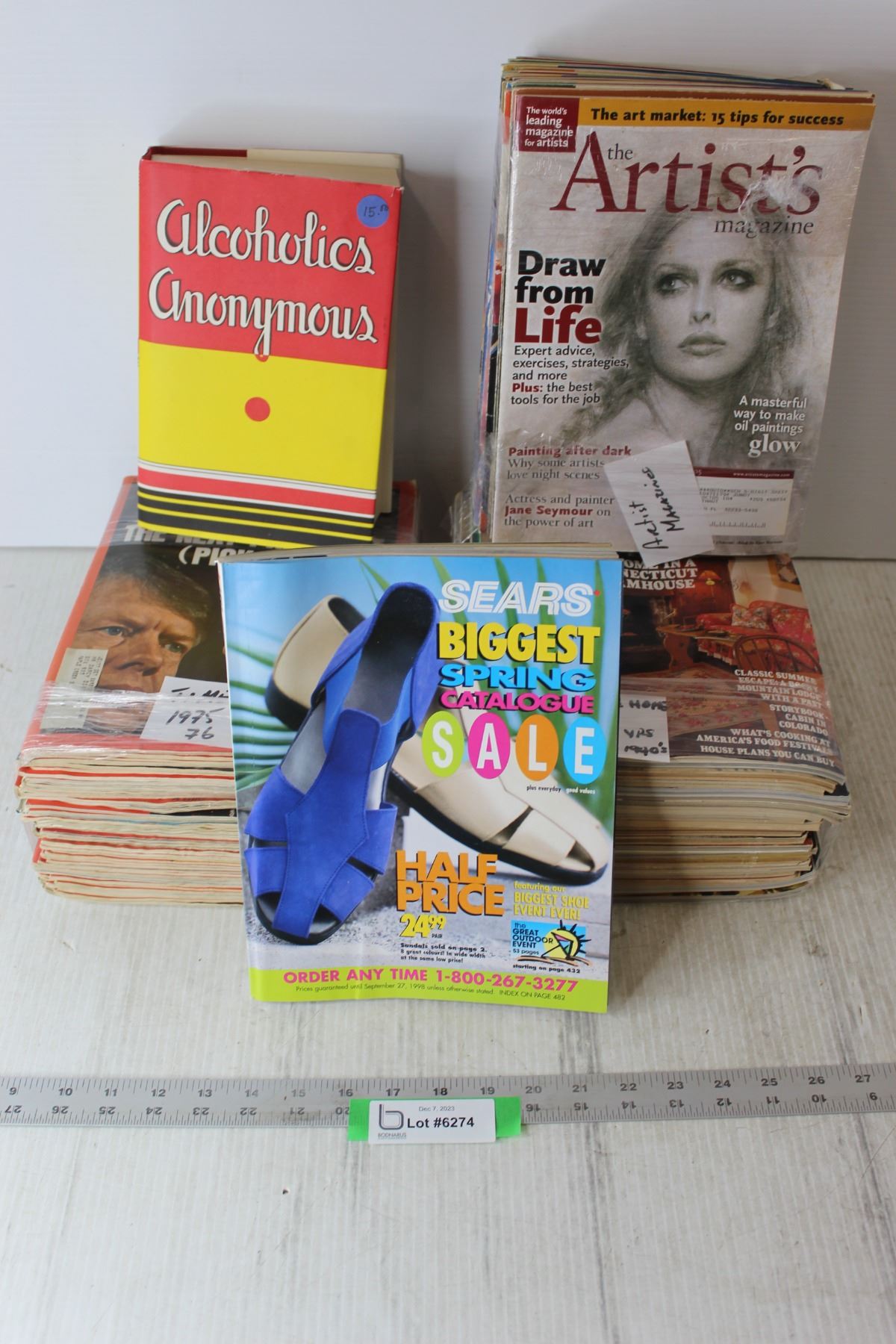 Assortment of Magazines, Tin, Alcoholics Anonymous Book, Wire Basket