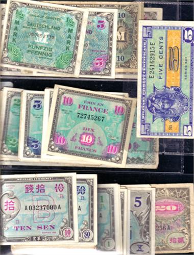 Assortment of Military Occupation Notes: Germany Series 1944 1/2 Mark, 5 Marks, 10 Marks four notes and 100 Marks; France Series 1944 5 Francs five notes, 5 Francs ten notes, 10 Francs eight notes and 50 Francs; Japan Series 100 10 Sen, 50 Sen thirty-three notes, 1 Yen seven notes, 5 Yen, 10 Yen and 20 Yen two notes and United States Series 521 5 Cents