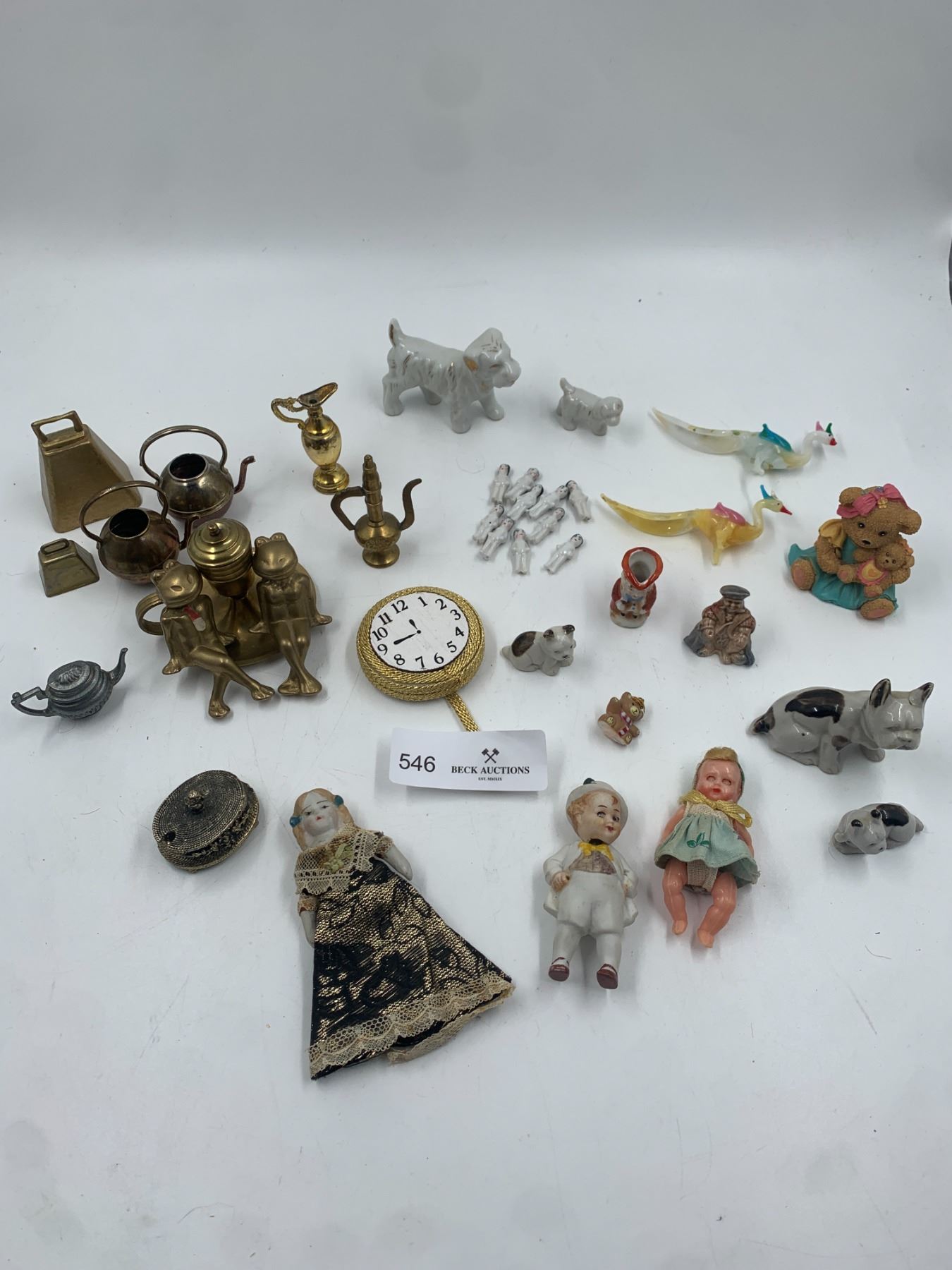 Assortment of Miniature Ceramic Dolls and Miniature Brass Doll Accessories