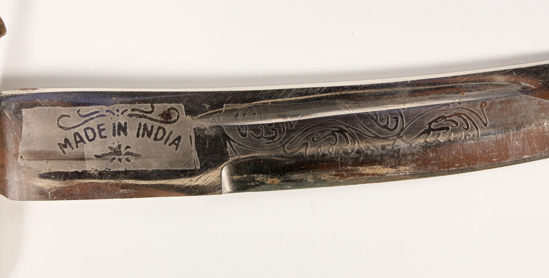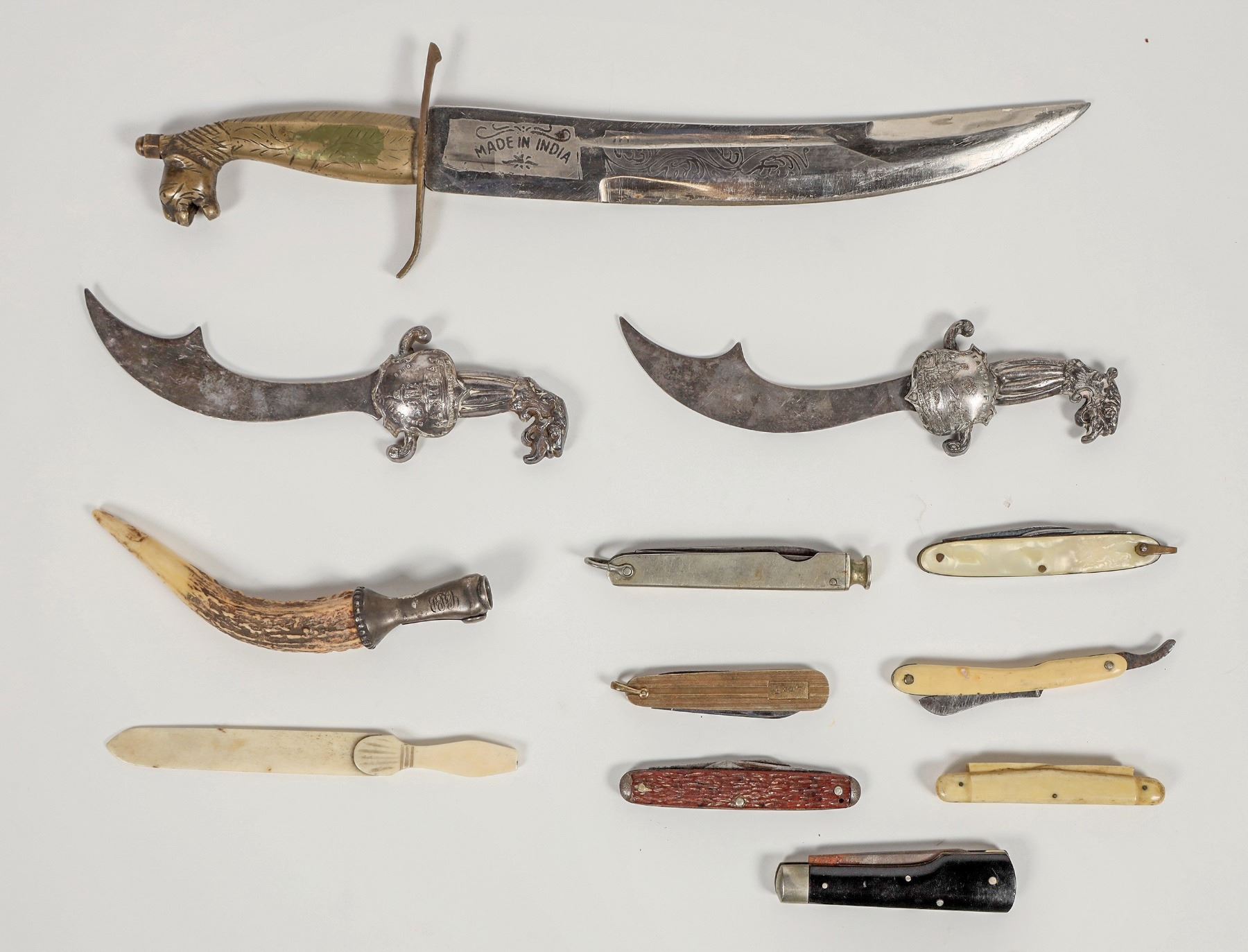 This group of knives are from the USA, India, and more. There is one sheath knife from India, a Schrade gunstock pruning knife with the paddle missing, two souvenir scimitar knives from Ohio and Florida; one pocket knife with tobacco tamp, and several others in disrepair. Twelve knives overall. Please see photo for details.