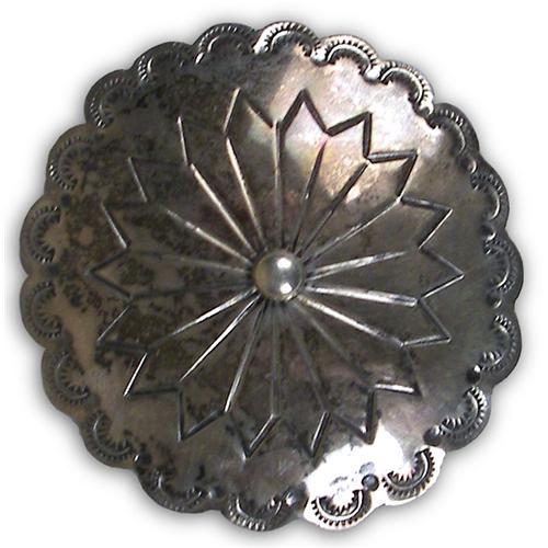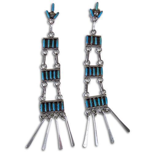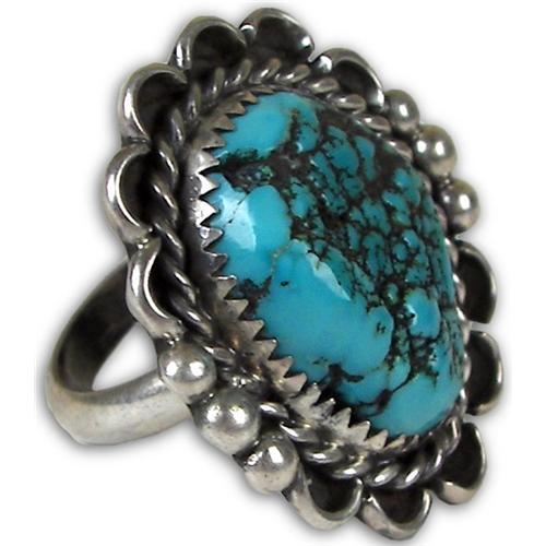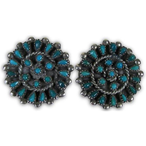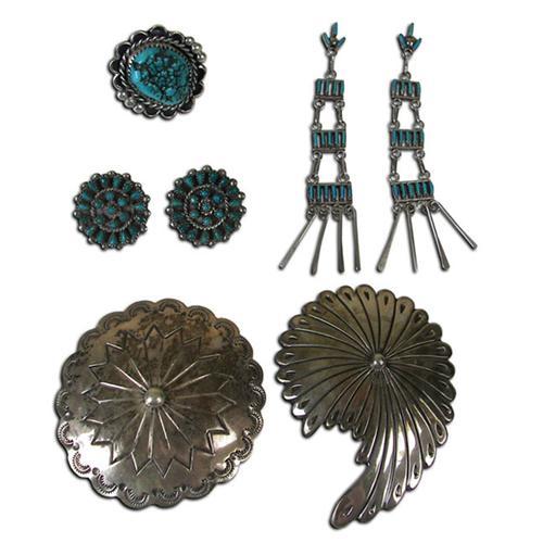 Assortment of Navajo Jewelry; Ring with Turquoise Nugget, 1 1/8" tall x 1" wide (3/4" diameter of loop); Pair of Dangle Earrings with Turquoise, 3" long; Pair of Clip Earrings with Turquoise, 7/8" diameter; Concho Pin, 2 1/8" diameter, stamped "Sterling"; Pin, 2 3/8" tall x 1 7/8" wide