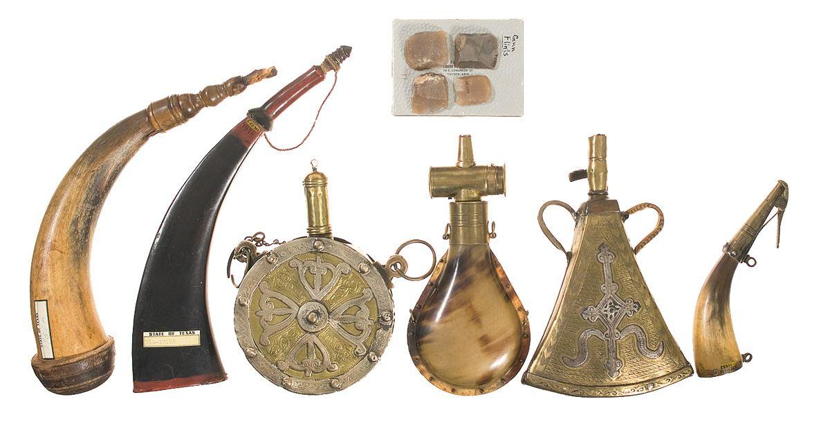 1) Powder horn with plugged wooden spout, has contemporary label marked "STATE OF TEXAS / 17560". 2) Small powder horn with brass spout. 3) Black and red painted powder horn, has contemporary label marked "STATE OF TEXAS / 724-17105". 4) Triangle shaped brass and copper powder flask with silver inlay. The carrying strap rings have been reattached, with some minor dents overall. 5) Powder flask made from horn with brass measuring spout. A couple of large chips absent. 6) Sliver inlaid circle shaped brass and copper powder flask, with some minor dents. Unless noted 1-6 are very good with some minor handling marks and are marked with a museum or private collection number (including the 11 pieces of gun flint that accompany this lot).