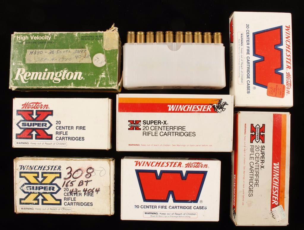 Including partial boxes of factory loads and full boxes of realoads: (1) Super X .32 Winchester Special. (2) 20 round boxes of .308. (3) Boxes of .30-30 Winchester. & (1) 18 round box of .22-250.
