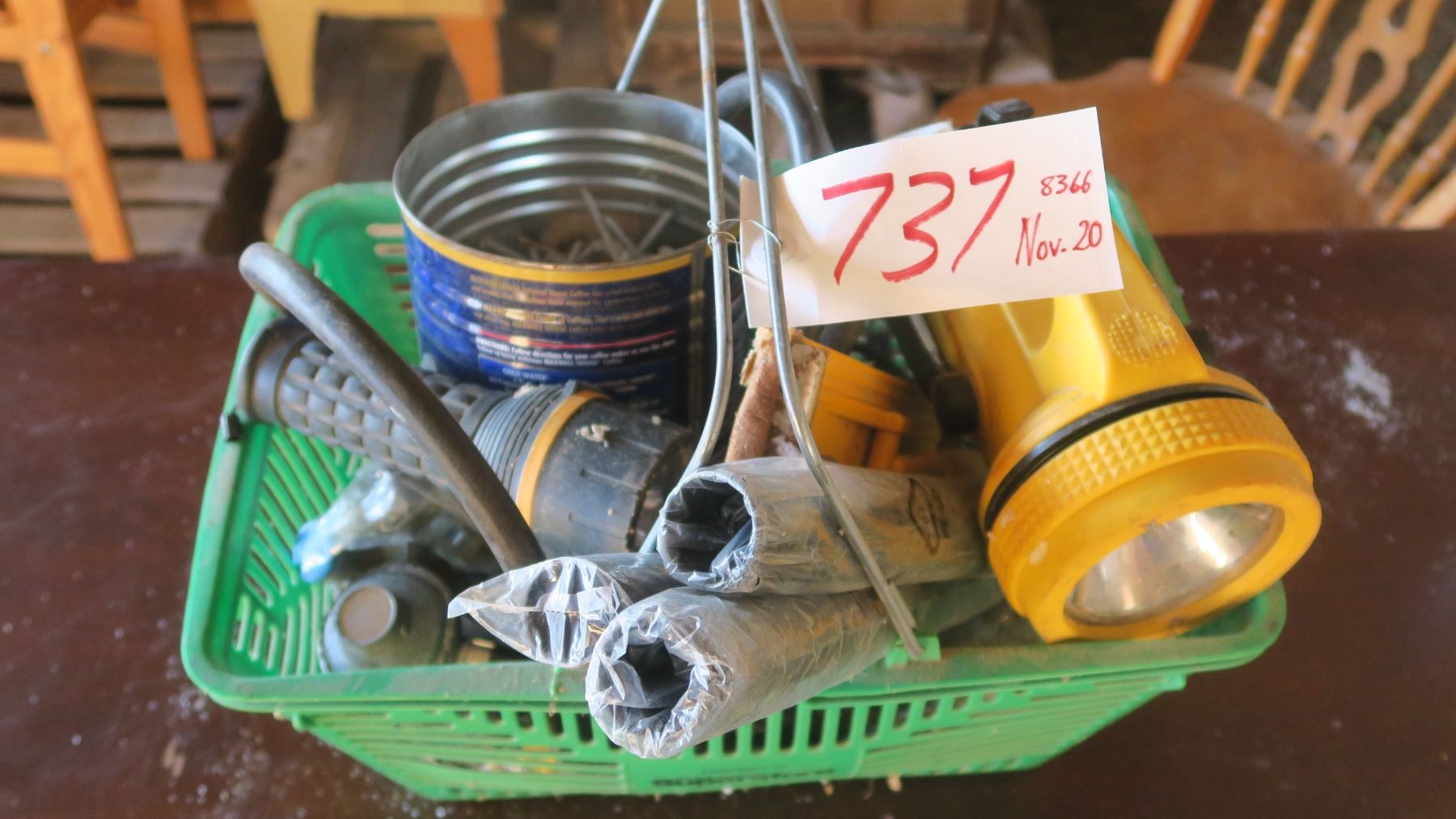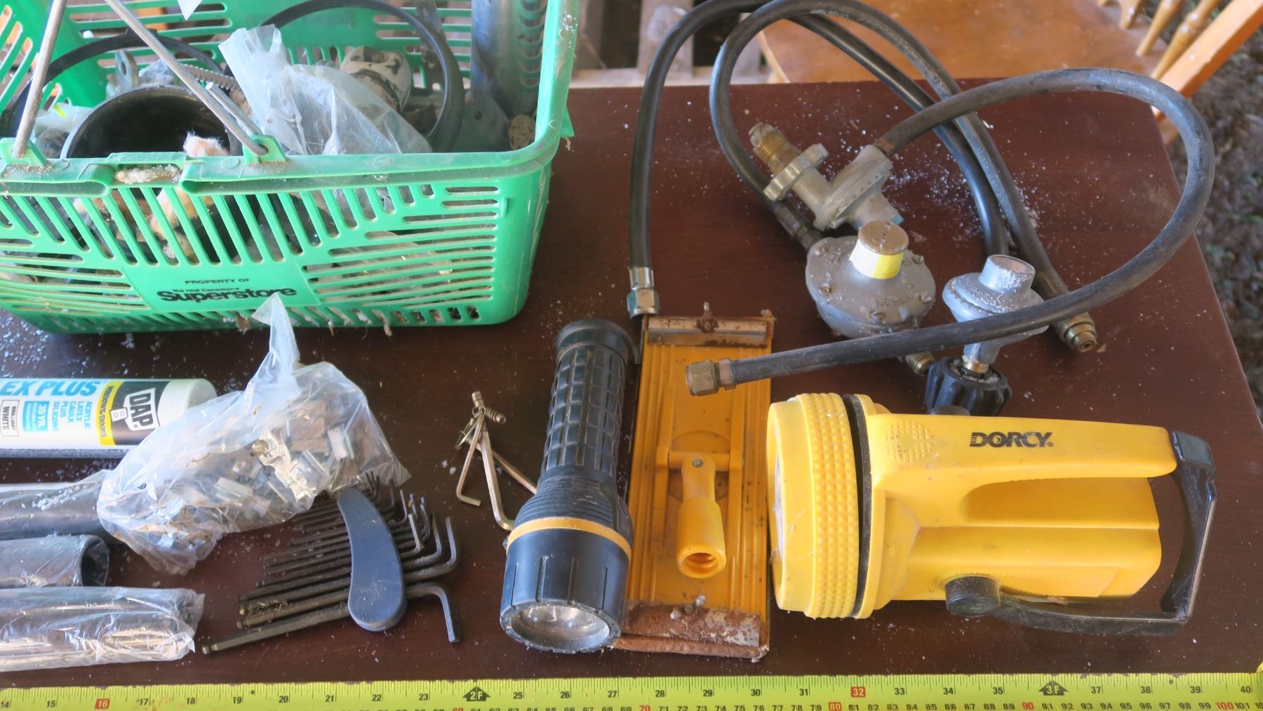 Assortment of Tools, flash lights, Allen wrenches, gas regulator hose, nails, etc.