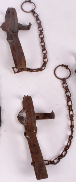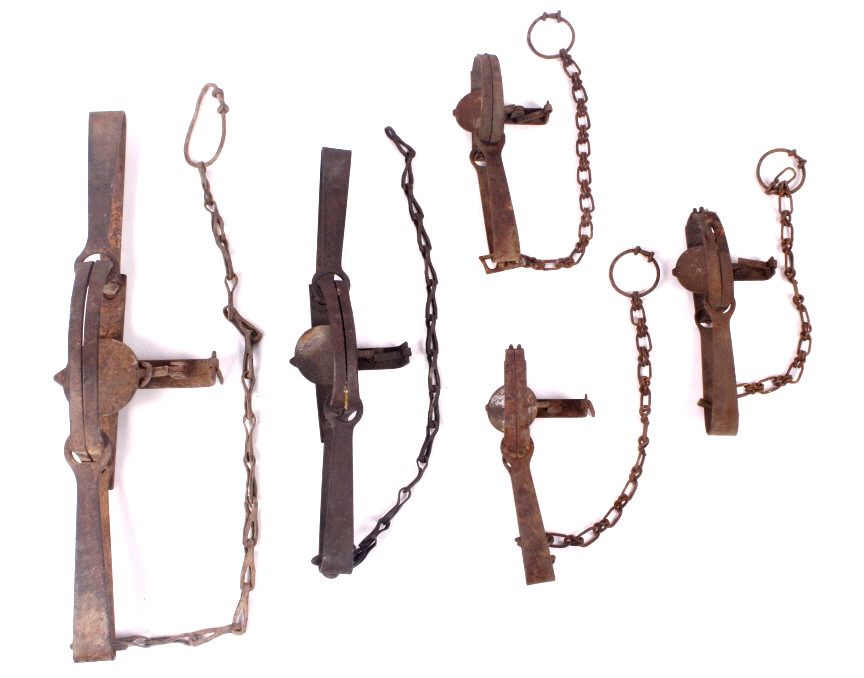 This lot includes 5 animal traps. The 2 larger taps are Newhouse #2 and #4. The 3 smaller ones are Blake and Lamb. They are in original condition and have a neat rustic look.