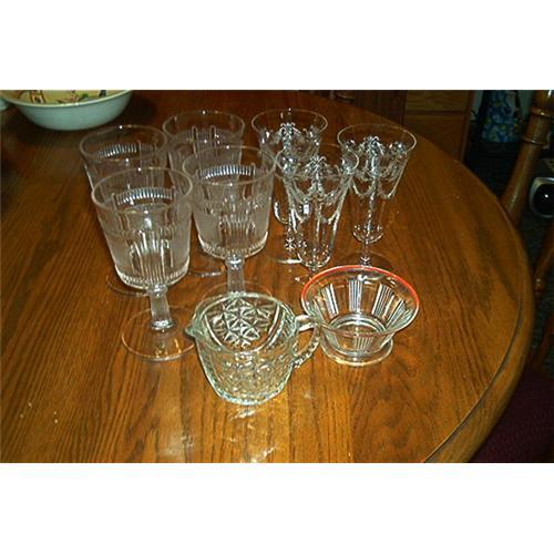 </font></strong>Featuring "9" vintage pieces of Early Pressed glassware with 3 of the glasses being made of crystal with lovely etched decorations. Features "4" Globlets (Heavy Glass), along with "3" crystal champaign decorative glasses. The globlets are in excellent condition. 2 of the three 3 decorative wedding champaign glasses have niplets along the top edges. The heavy decorative creamer and the sherbert dish, which has a red ring around the top edge, are in excellent condition. All pieces are in very good to excellent condition.</font>
