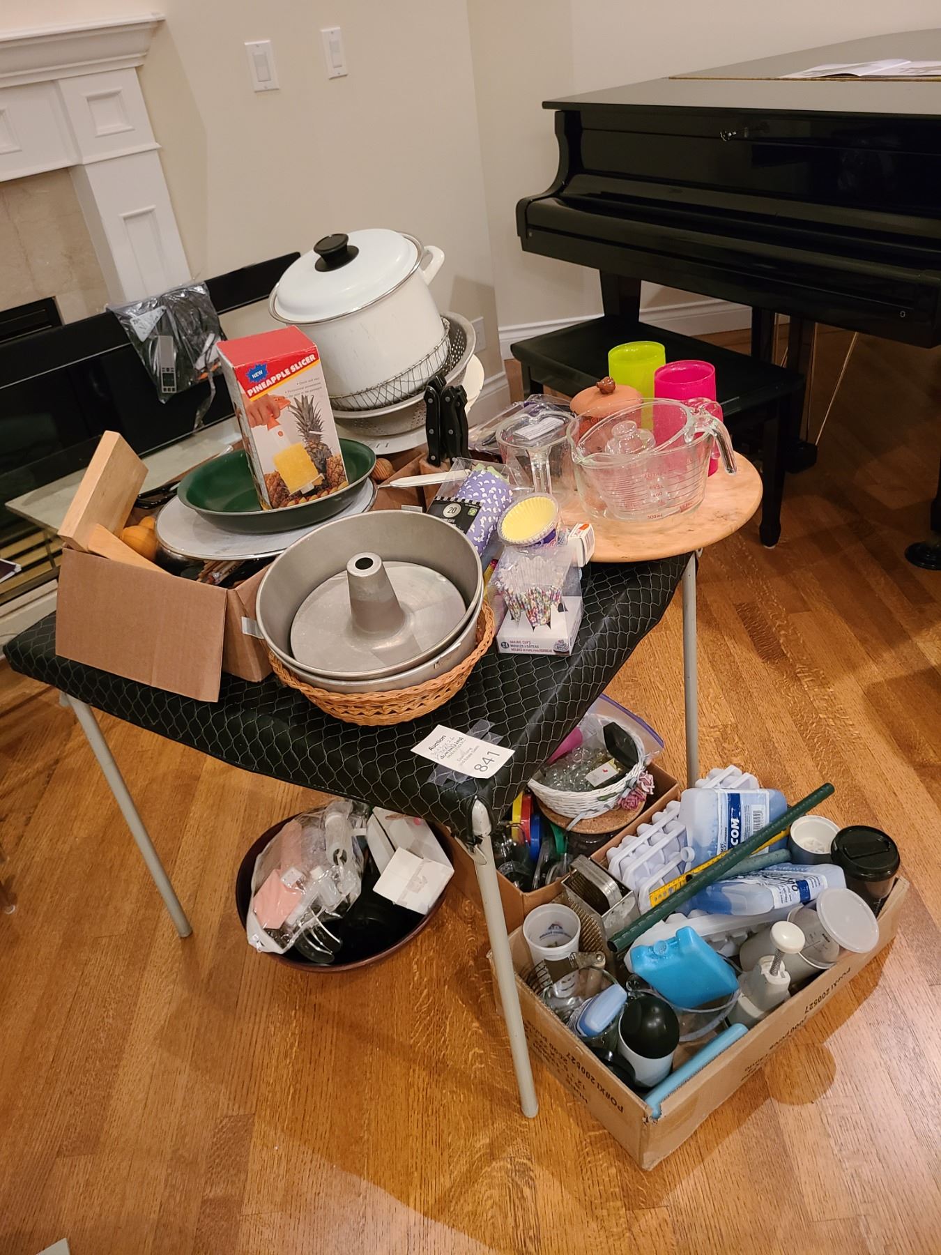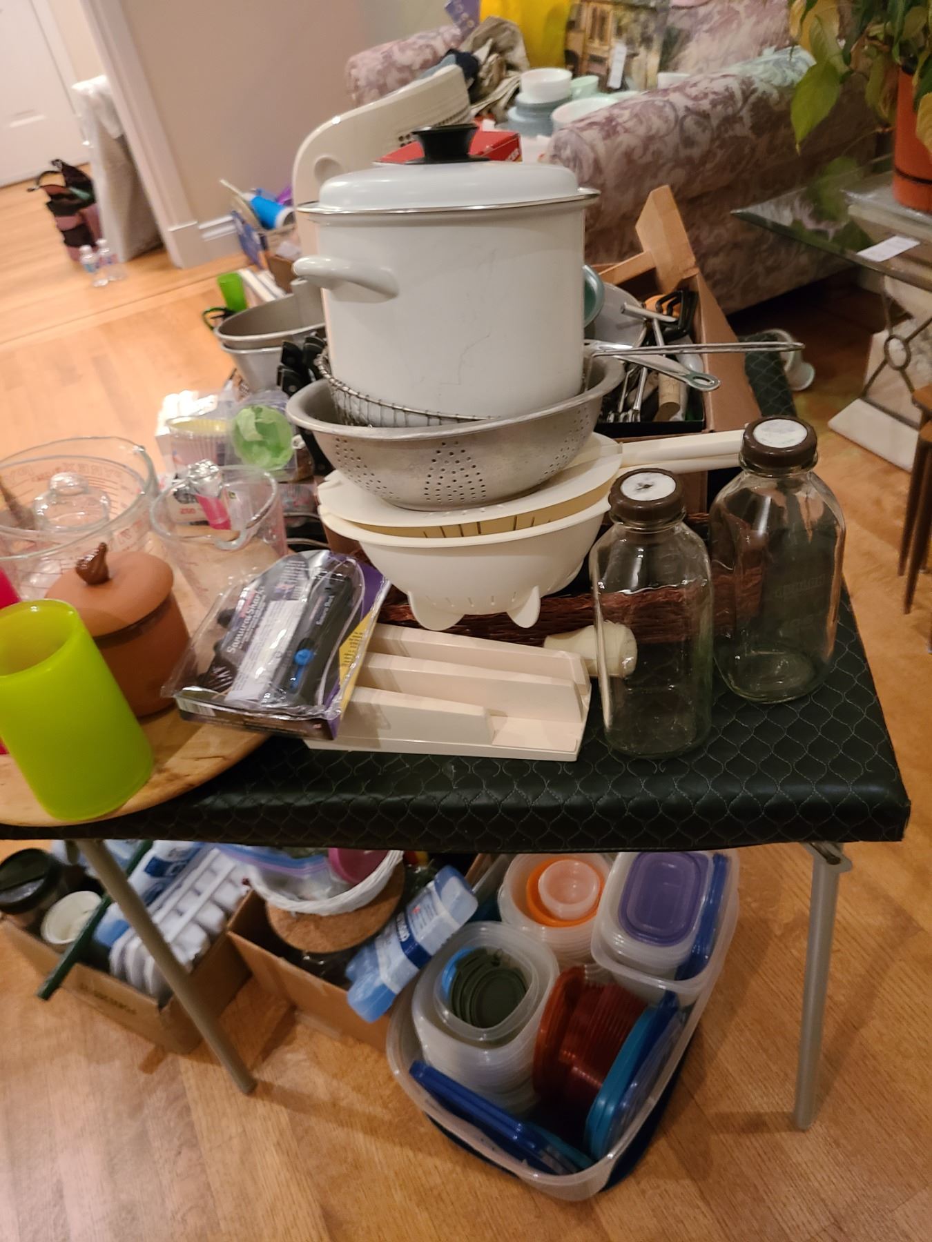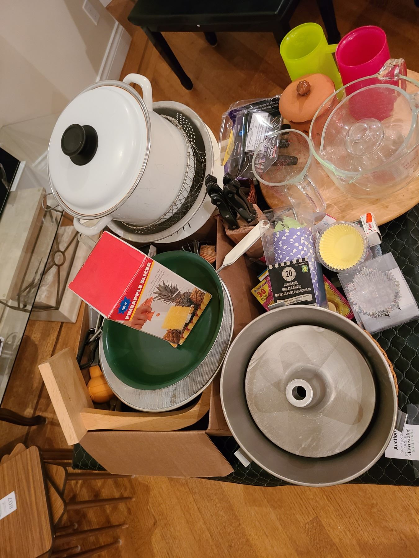 Large lot of kitchen utensils, Pyrex measuremening jugs, and more. Bring packing supplies and pick up at 9am