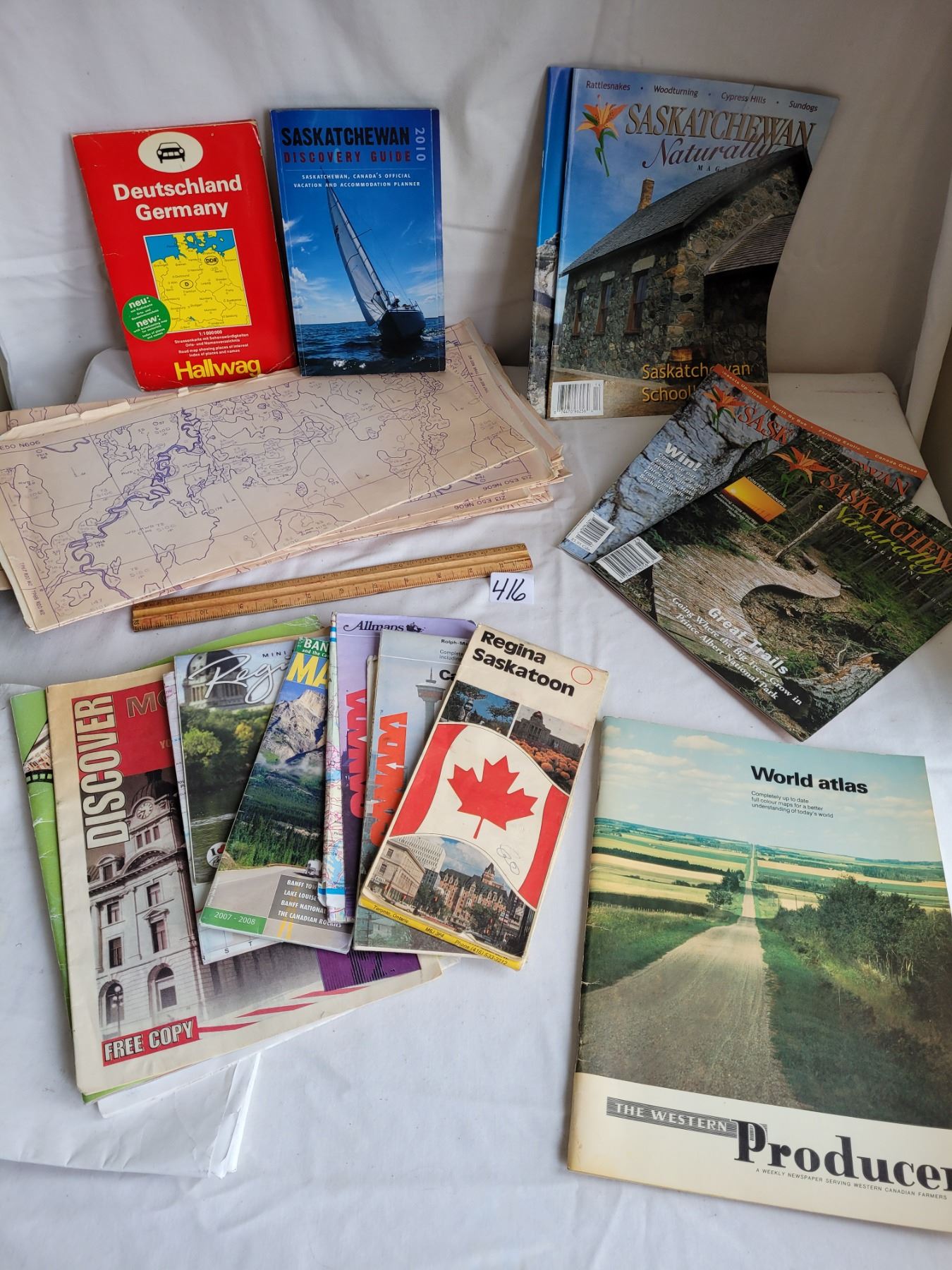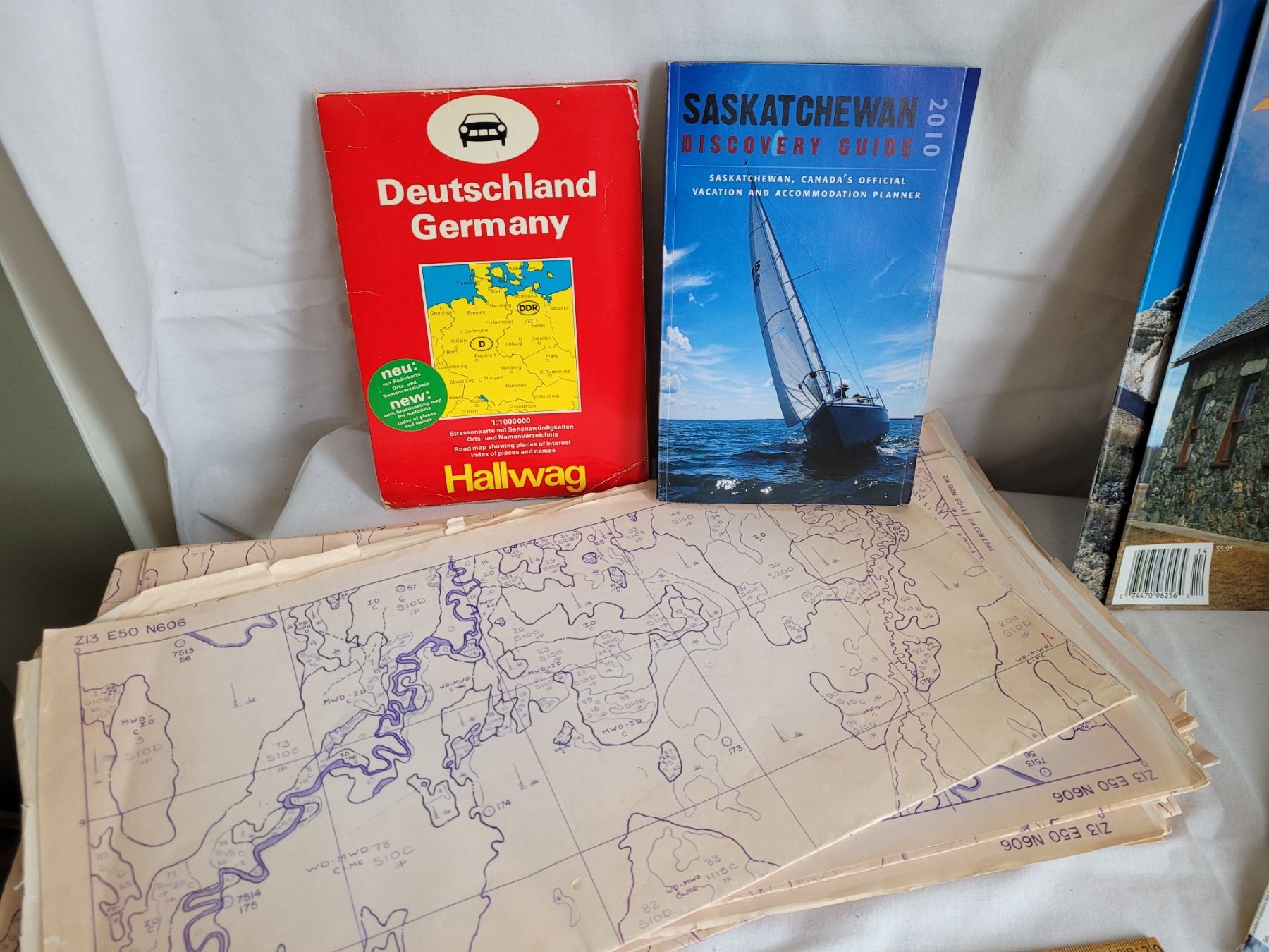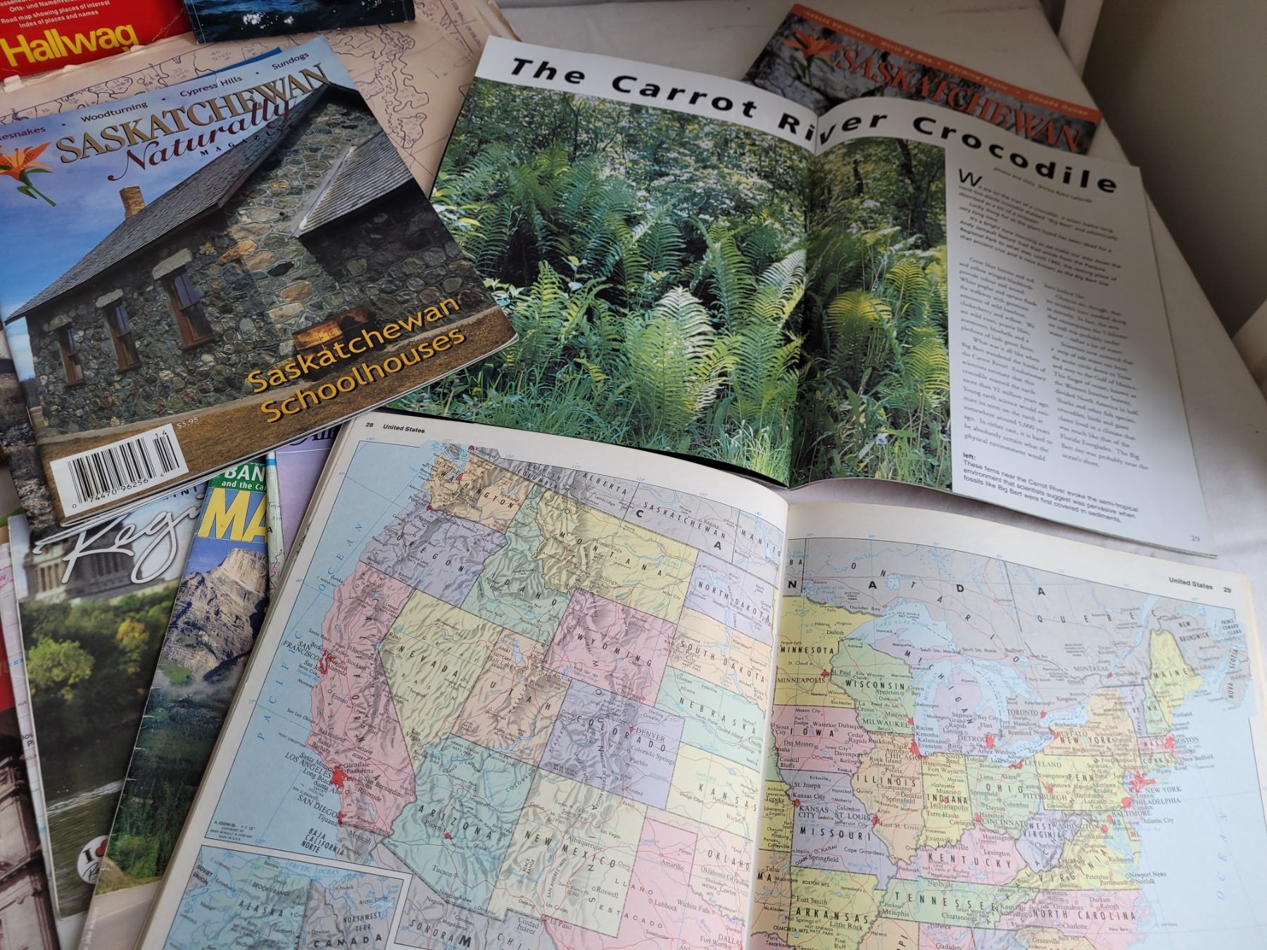 Assortment of older Saskatchewan maps including 1950's topographical maps from the Hanson Lake road area. Saskatchewan Naturally magazines.