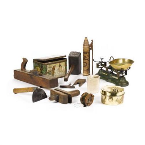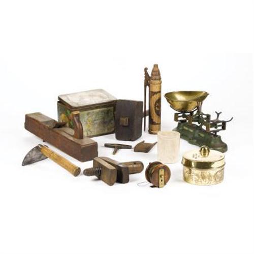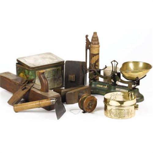 <B>An Assortment of Ten Decorative Items</B></I><BR>Including a painted metal box; a surveyor's level; a brass film tank; a carnegie scale; a wooden vise; a wooden mallet; a wooden reel with line; a wooden carpenter's plane. <BR><BR><b>Shipping:</b> Requires 3rd Party Shipping (<a target="_blank" href="http://www.heritageauctions.com/common/shipping.php">view shipping information</a>)