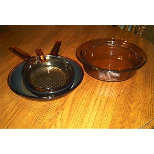 </font></strong>Featuring '3' glass Visionware Skillets and one large casserole bowl. All items are in excellent condition. Two skillets have a non-stick finish. One skillet is clear glass.The largest skillet measures 1 3/4 inches tall; opening diameter of 10 inches; depth 2 1/2 inches; Handle measures 6 inches long; Bottom base measures 8 inches in diameter. All handles states: Vision Corningware along with the casserole dish.The two smaller skillets measures 1 3/4 inches tall; opening diameter measures 7 inches; one skillet has a waffleweave design in the bottom of it Bottom base measures 6 1/2 inches in diameter; Also featured is the large casserole bowl; Measures 3 1/4 inches tall; opening diameter measures 11 inches; depth measures 3 inches; base diameter measures 8 1/2 inches; Bottom embossed: Vision-2.5 qts. Corningware; V-33-B-OVEN-MICROWAVE-RANGE TOP-FREEZER. All four items are in excellent condition.</font>
