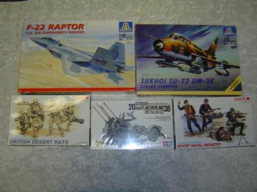 Italeri 1/72 Sukhoi SU-22 UM-3K Strike Fighter, 1/48 F22 Raptor, DML 3013 1/35 British Desert Rats, 3005 135 Spvoet Naval Infantry, Tamiya 35091 1/35 Gernam 20mm Flakvierling 38