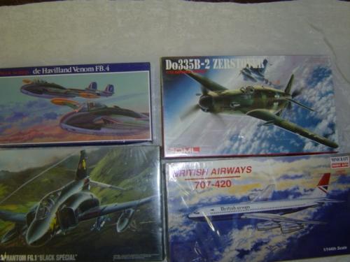 Glencoe # 05107 1/48 deHavilland Venom FB4, Fujimi # 1056 1/72 BritishPhantom FG.1, DML # 9006 1/72 Do335B-2 Zerstover, Minicraft 14485 1/144 Brisith Airways 707-420