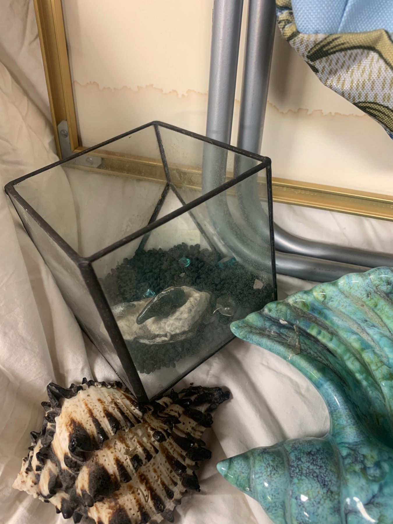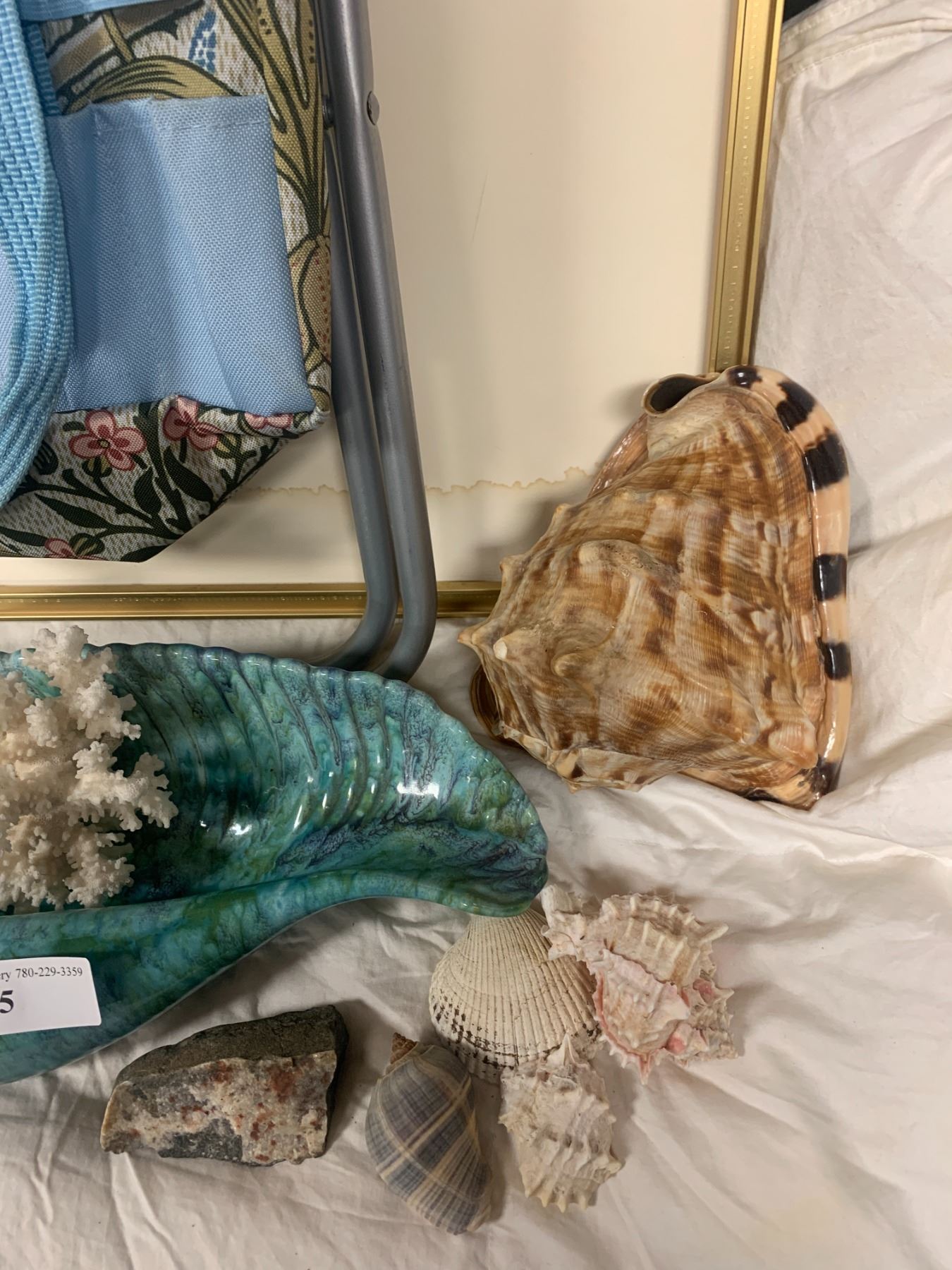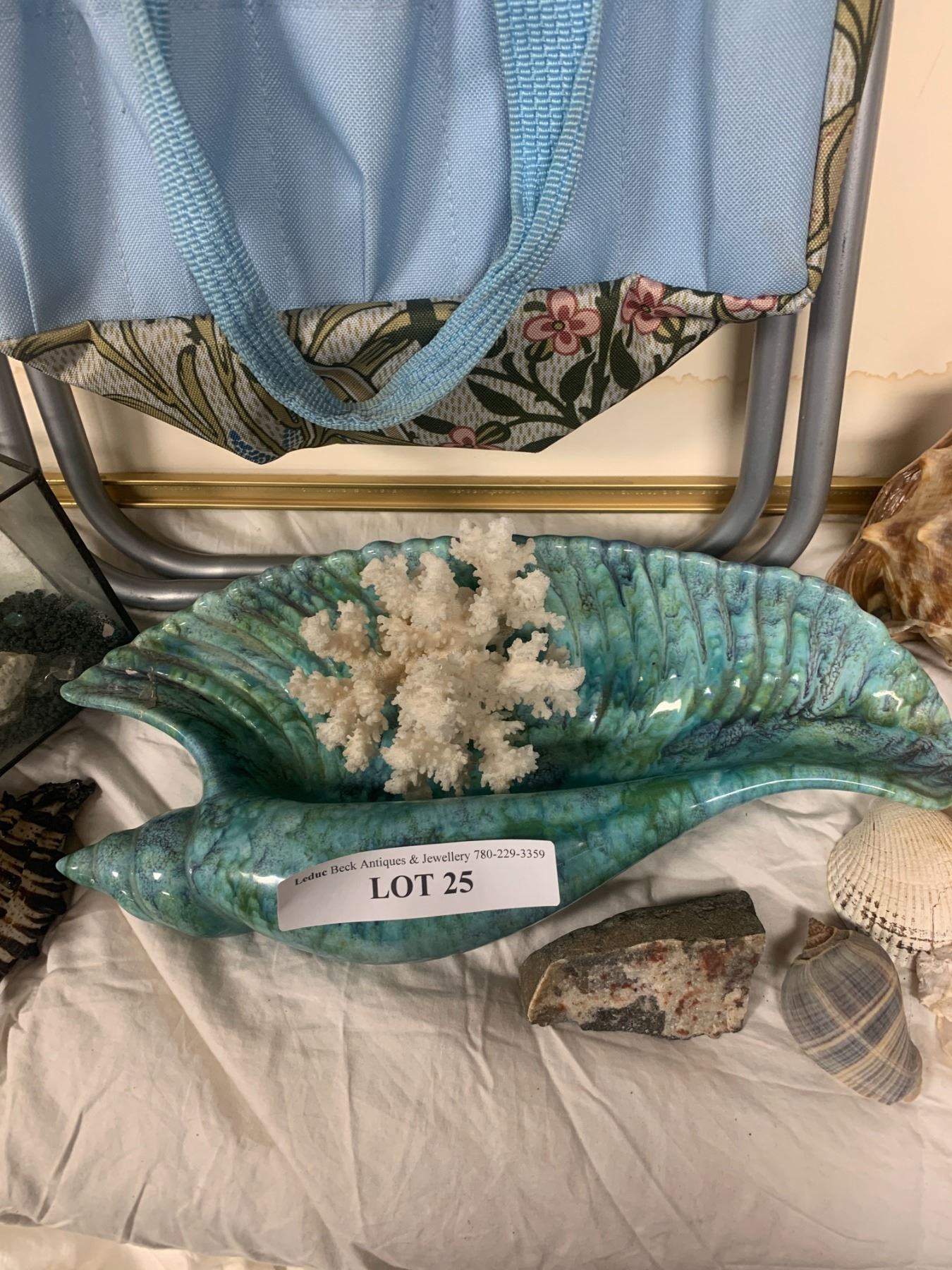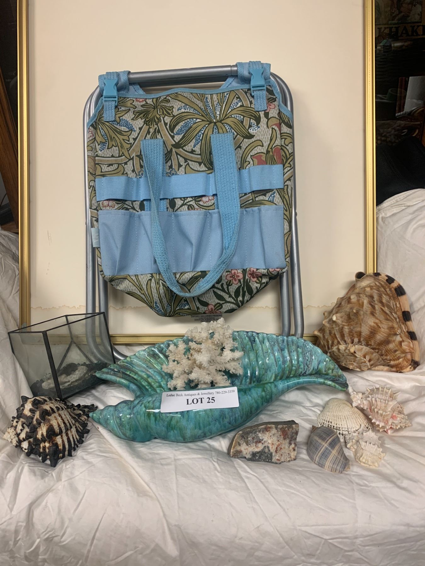 Asst Seashells, Glass Display Box, Green Porcelain Seashell & Storage Stool