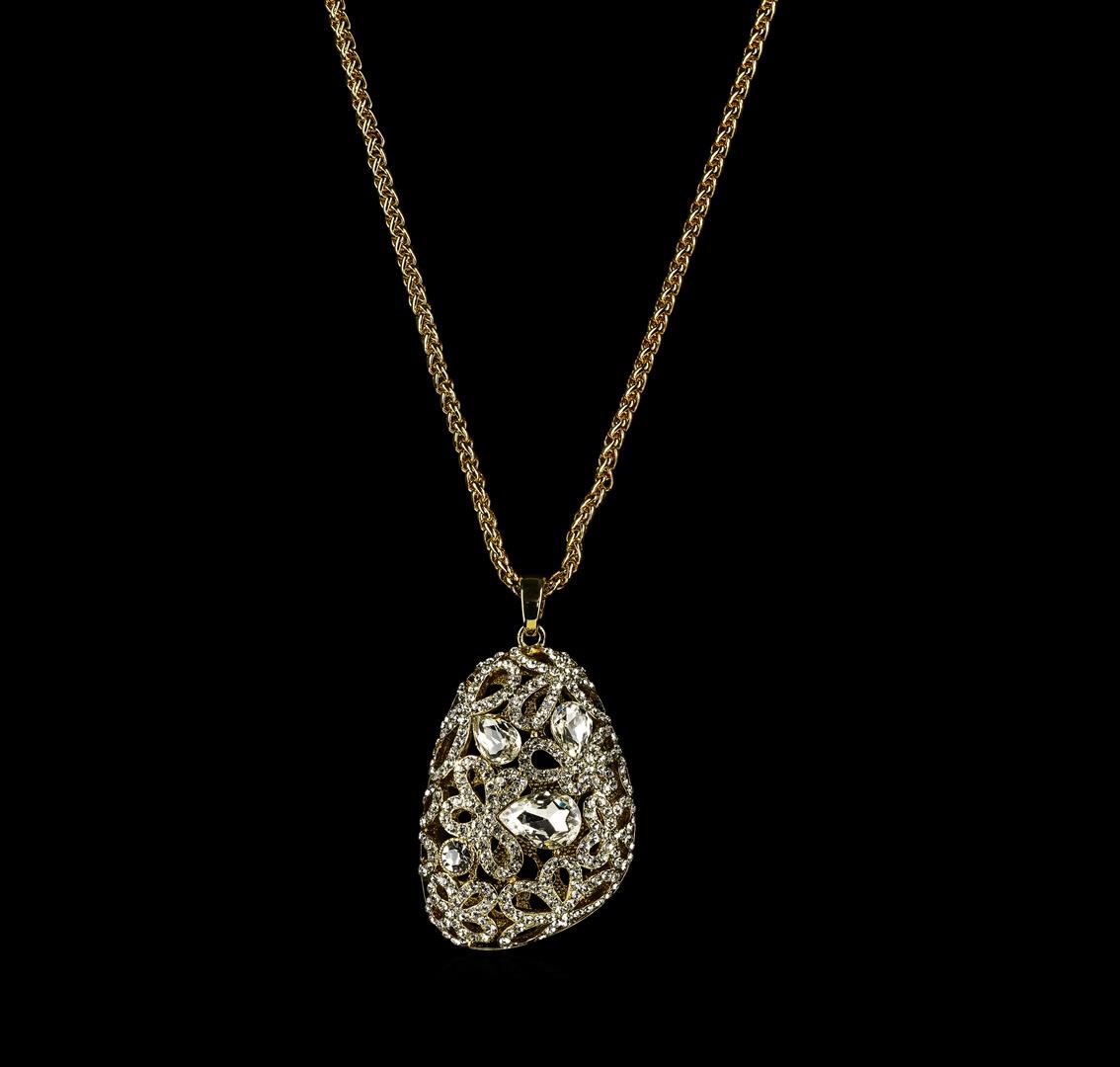 High end designer jewelry. Assym Filigree Crystal Pendant - Gold Plated. Gold Chain L. Necklace. Gold/ Clear. 32/2.5inches. Total Weight: 56.3 grams.