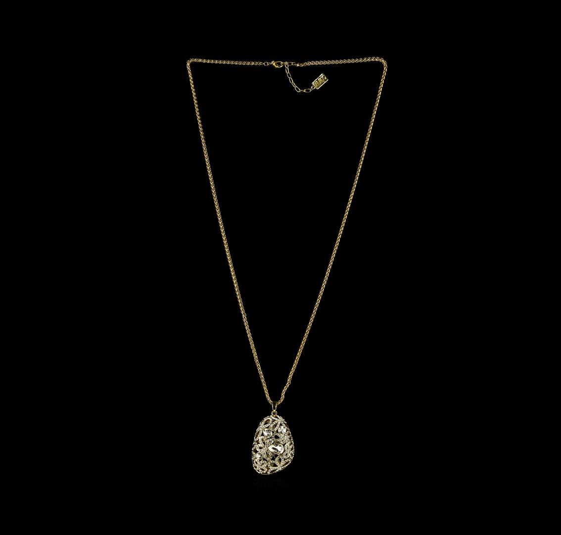 High end designer jewelry. Assym Filigree Crystal Pendant - Gold Plated. Gold Chain L. Necklace. Gold/ Clear. 32/2.5inches. Total Weight: 56.3 grams.