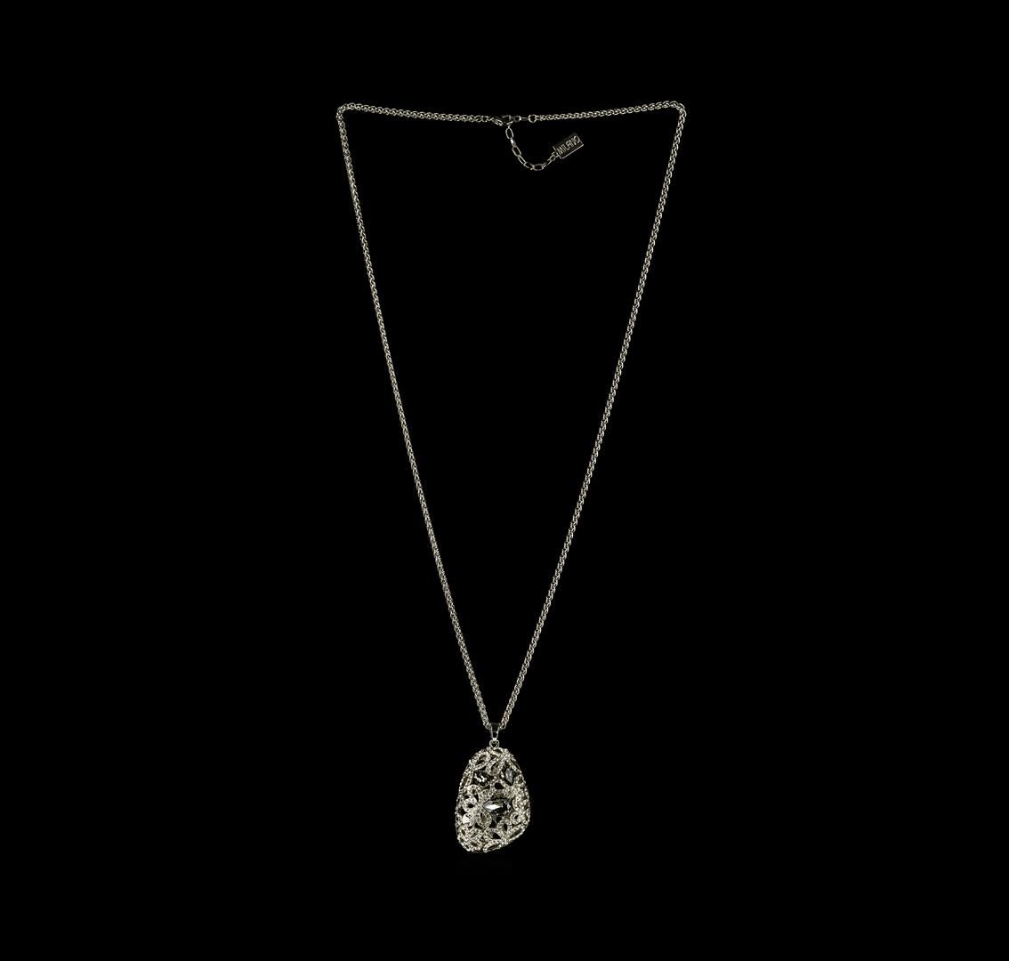 High end designer jewelry. Assym Filigree Crystal Pendant Necklace - Silver. Silver Chain L. Necklace. Silver/ Smoky. 32/2.5inches. Total Weight: 54.4 grams.