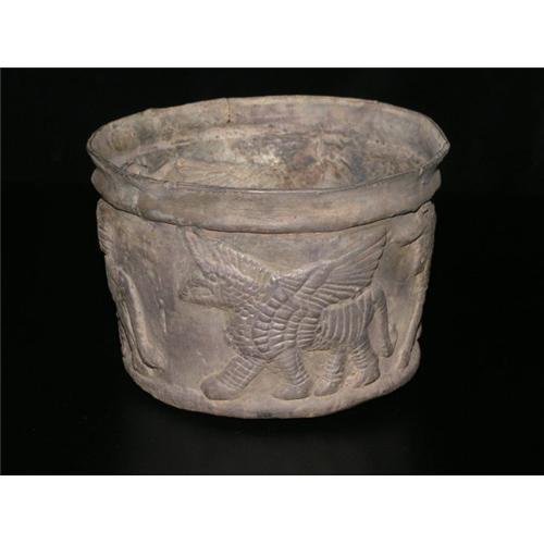 An extremely rare "Assyrian silver Bowl with winged animal figures"-- There are four figures around the bowl with a presentation of a lion, bull and a deity. Intact.
