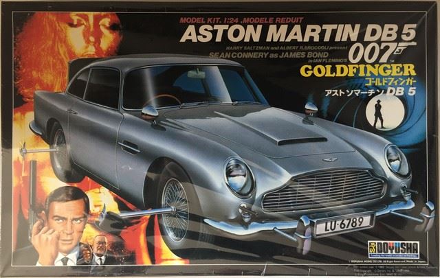 Aston Martin DB 5 007 Goldfinger model kit 1:24 scale. Mayde by Doyusha Model Co. Wrapped in plastic. Never opened. Top of plastic cover has split open by the seam. Great condition. (15"x10"3")