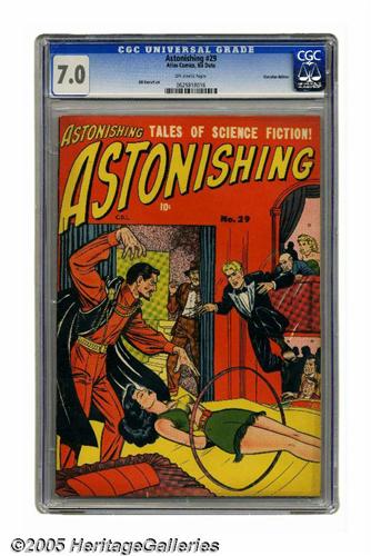 <B>Astonishing #29 Canadian Edition (Bell Features, circa 1954) CGC FN/VF 7.0 Off-white pages.</B></I> This Canadian edition does not have the same cover image as the U.S. #29 (or any other issue of the Atlas series), but it may well be that the U.S. cover, featuring a creature carrying its own grinning severed head, was replaced because it was too shocking! Adding to the mystery is the logo style, which is the one used only for issues 3-5 of the U.S. series. Canadian edition not listed in Overstreet. CGC census 7/05 (for the Canadian edition): 1 in 7.0, none higher.