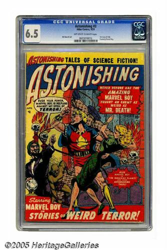 <B>Astonishing #3 (Atlas, 1951) CGC FN+ 6.5 Off-white to white pages.</B></I> This is the first issue of the title following the name change from <B>Marvel Boy.</B></I> The cover bills it as both terror and science fiction fare, and the mix also includes Marvel Boy, in the days when superheroes in comics were few and far between. The cover and interior art are by Bill Everett. Overstreet 2005 FN 6.0 value = $276; VF 8.0 value = $575. CGC census 7/05: 1 in 6.5, 1 higher.