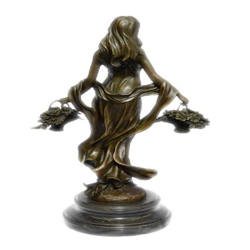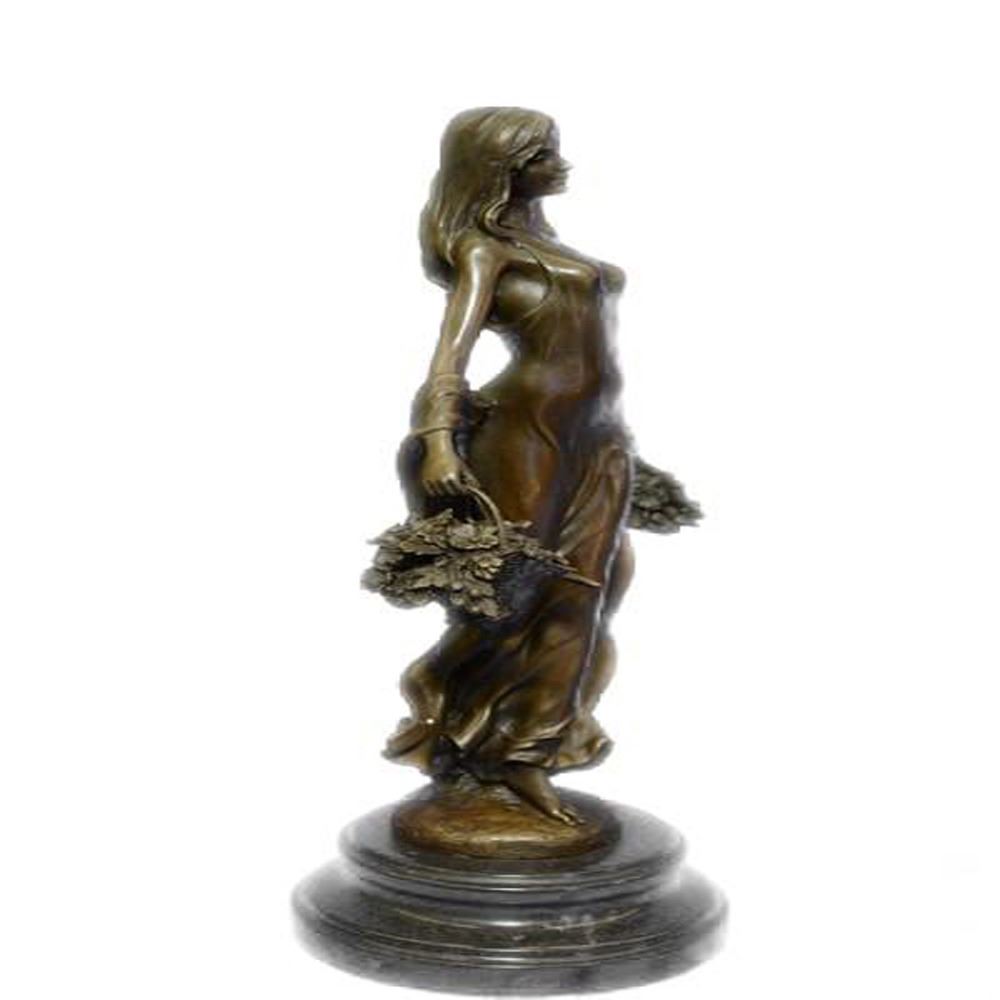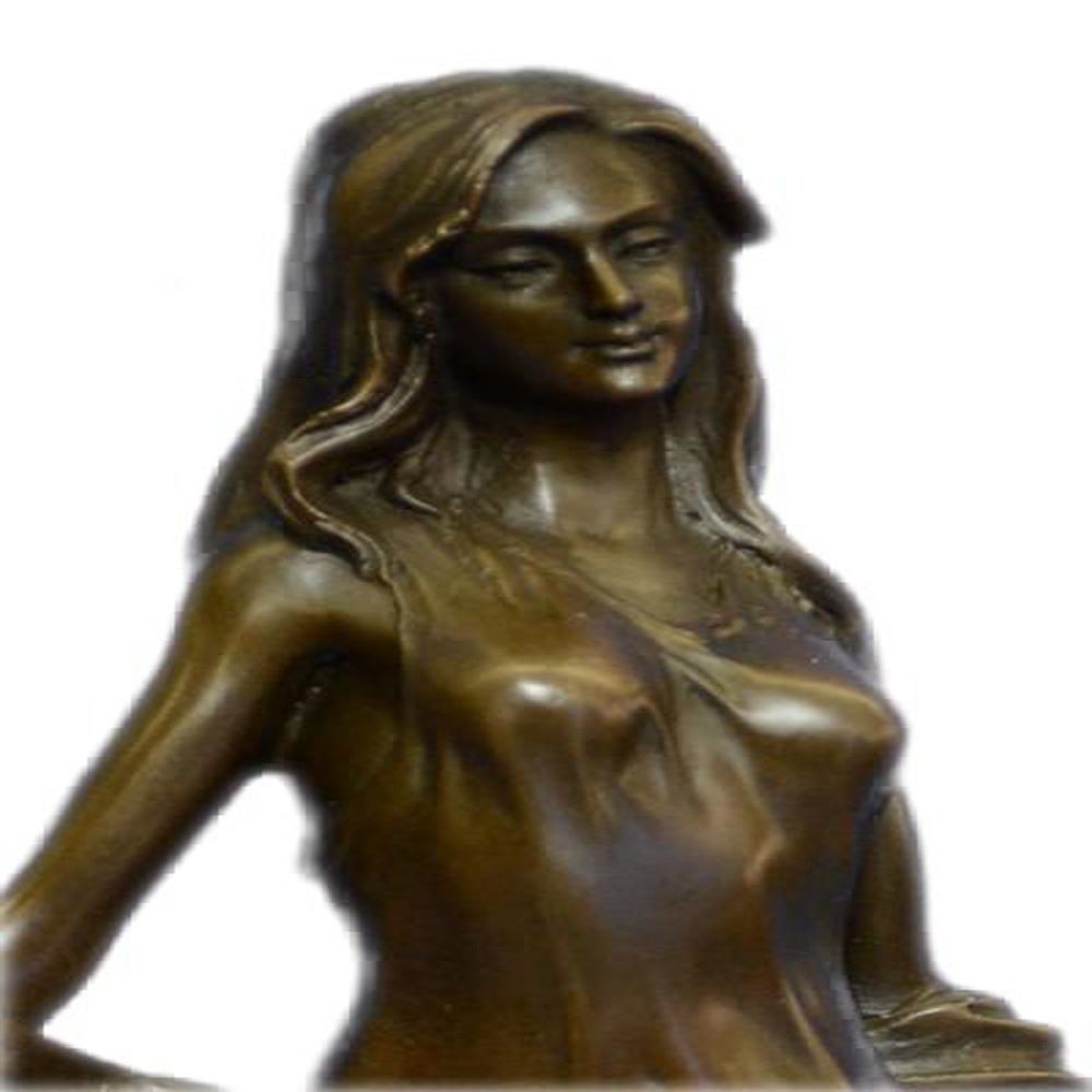 This astonishing girl stand with a graceful smile upon her face as she looks to one side. Her dress is amazing and lovely, long with these beautiful flows from behind her giving her an extra reason to be placed as your living room decor. She is a sexy woman, thick in all the right places. Her dress is a bit see through yet it has the most gorgeous details on it that would not be seen all in one day, the more you view it the more you will find extra exquisite details. The Sculpture is cast using the ancient old Lost Wax Method stained in brown patina and mounted atop a marble base. Bronze Dimensions with Marble Base: Height 15 X Width 8 inches. Weight: 10 LBS.