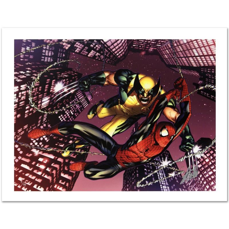 A piece of comic book history, this limited edition, from original art by Adam Kubert, depicts the heroic Spider-Man and Wolverine. Adam Kubert began his professional comics career at age 12 as a letterer. He went on to attend the Rochester Institute of Technology, graduating with a degree in medical illustration. He subsequently attended The Kubert School in Dover, New Jersey. He is known for his work on such titles as: Ultimate X-Men, Ultimate Fantastic Four, Incredible Hulk, Wolverine. "Astonishing Spider-Man & Wolverine #1" is a limited edition giclee on canvas by Adam Kubert presented by Marvel Comics, numbered and hand signed by the great Stan Lee! Includes Certificate of Authenticity! Measures approx. 24" x 18" (image).