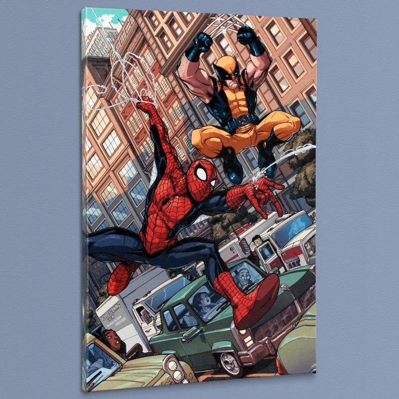 A piece of comic book history, this limited edition print, drawn by Nicholas Bradshaw, depicts Wolverine and Spider-Man. Nick Bradshaw is a Canadian artist, primarily involved in the comic book industry. He has started out as penciler for Army of Darkness comics from Dynamic Forces. Currently, he is working for Marvel Comics on a variety of titles, most recently Wolverine and the X-men. "Astonishing Spider-Man & Wolverine #1" is a limited edition numbered giclee on canvas by Nicholas Bradshaw presented by Marvel Comics. This piece comes gallery wrapped and ready to hang. Includes Certificate of Authenticity! Measures approx. 18" x 27" (image).