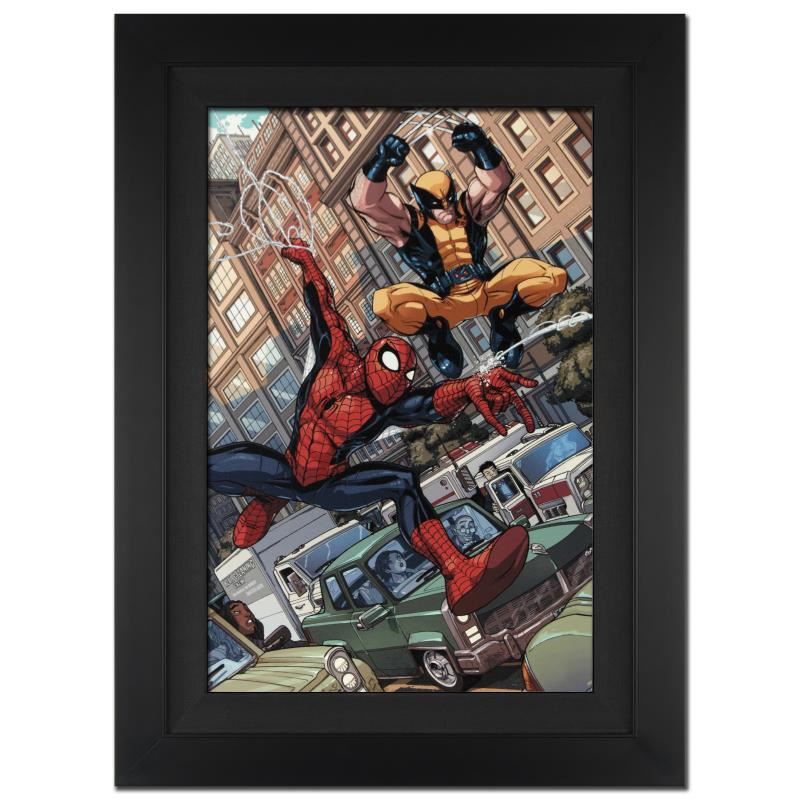 A piece of comic book history, this limited edition piece from art originally drawn by Nicholas Bradshaw, depicts Wolverine and Spider-Man. Nick Bradshaw is a Canadian artist, primarily involved in the comic book industry. He started out as penciler for Army of Darkness comics from Dynamic Forces. Currently, he is working for Marvel Comics on a variety of titles, most recently Wolverine and the X-men. "Astonishing Spider-Man and Wolverine #1" is an extremely limited edition giclee on canvas by Nicholas Bradshaw presented by Marvel Comics, hand signed by the great Stan Lee and numbered out of only 10! This piece has been custom framed and ready to hang. Includes Certificate of Authenticity! Measures approx. 25" x 34" (with frame); 18" x 27" (image).