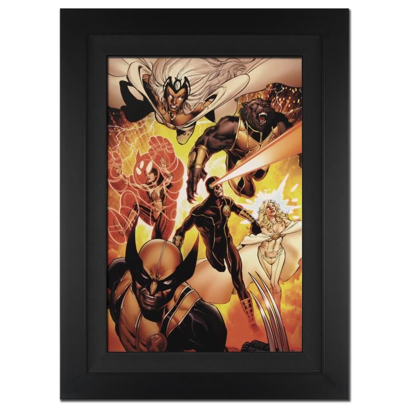A piece of comic book history, this limited edition, from original art by Phil Jimenez, depicts members of the heroic X-Men team. Initially working for DC Comics, Phil Jimenez signed an exclusive contract with Marvel in 2007. Since then, he has been one of four artists working on "Amazing Spider-Man" and he has also worked on various X-Men titles. "Astonishing X-Men #35" is an extremely limited edition giclee on canvas by Phil Jimenez presented by Marvel Comics, hand signed by the great Stan Lee and numbered out of only 10! This piece comes custom framed and ready to hang. Includes Certificate of Authenticity! Measures approx. 25" x 34" (with frame), 18" x 27" (image).