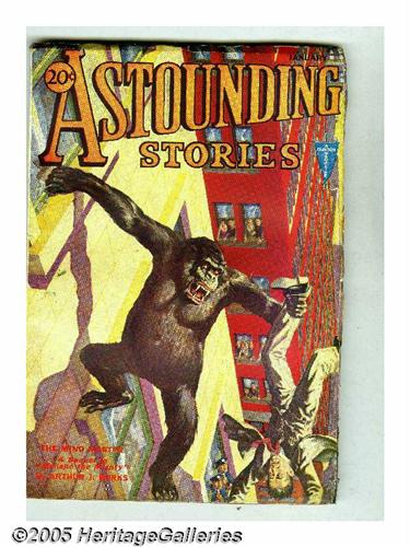 <B>Astounding Stories Jan 1932 (V9#1) (Street & Smith, 1932) Condition: FN-.</B></I> Go ape with this great gorilla cover, which was (surprisingly enough) published a year <I>before</B></I> "King Kong." The cover artwork is by Han Wessolowski. Nice spine with no paper loss or fading. Cover paper is white, interior pages are cream to light tan. Don't monkey around -- bid now! The Ultimate Guide to the Pulps VG value = $150.