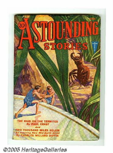 <B>Astounding Stories June 1932 (V10#3) (Street & Smith, 1932) Condition: FN.</B></I> Hans Wessolowski provides a memorable piece of cover art, as two tiny men seek shelter from a menacing insect. Full, unfaded spine, and minimal overhang wear. Inside covers are white, pages are cream to light tan. The Ultimate Guide to the Pulps VG value = $100.