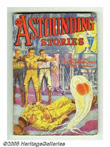 <B>Astounding Stories Nov 1932 (V11#2) (Street & Smith, 1932) Condition: FN-.</B></I> Hans Wessolowski's cover art looks great on this clean, colorful, high-grade pulp. Full, unfaded spine. Inside covers are white, pages are a supple cream to light tan. Includes a story by Arthur Zagat. The Ultimate Guide to the Pulps VG value = $50.