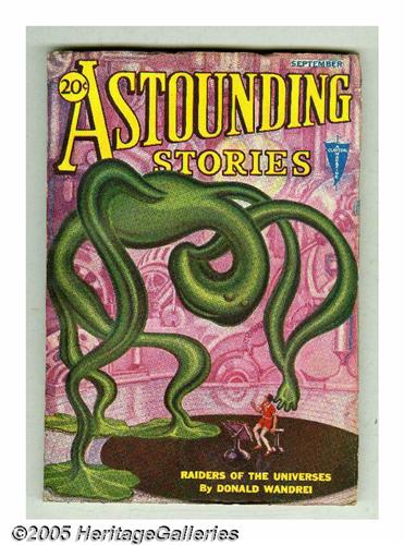 <B>Astounding Stories Sept 1932 (V11#1) (Street & Smith, 1932) Condition: FN.</B></I> Hans Wessolowski cover art features a weird green alien. Full, unfaded spine. Inside covers are white, pages are a supple cream to light tan. Story by Arkham House co-founder Donald Wandrei. The Ultimate Guide to the Pulps VG value = $50.