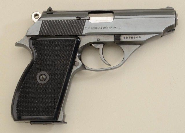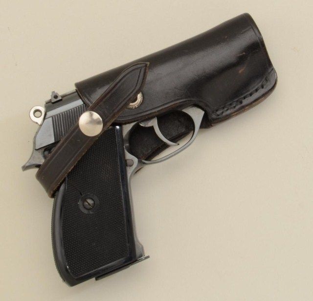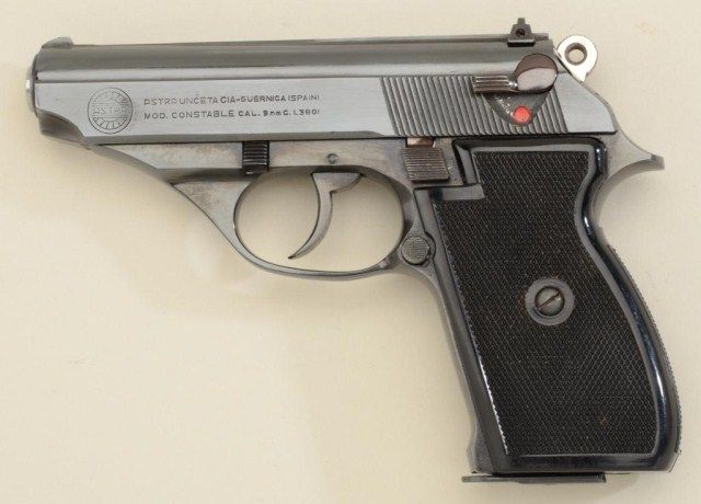 Astra Constable Model DA semi-auto pistol, blue finish, checkered plastic grips, #1075909 with Bianchi leather holster. This gun is in overall excellent condition showing little use; grip shows a crack on the rightside from the screw to the back strap. Est.: $250-$350.