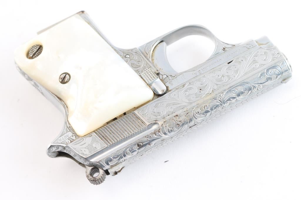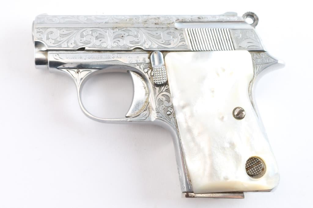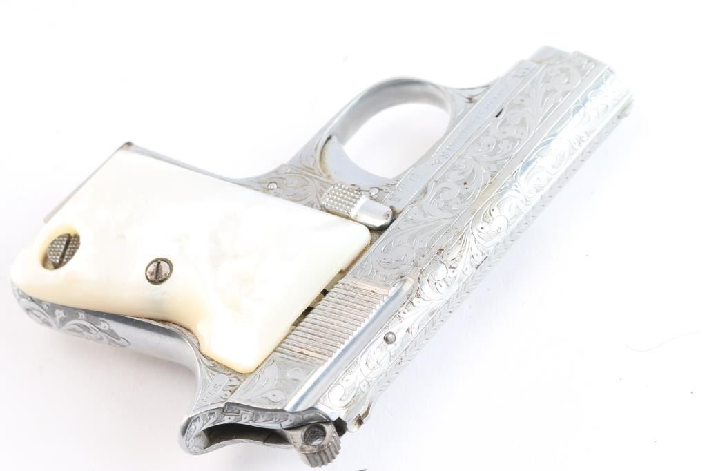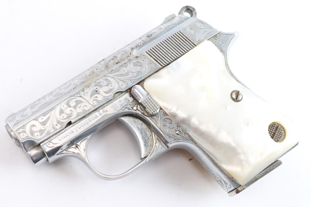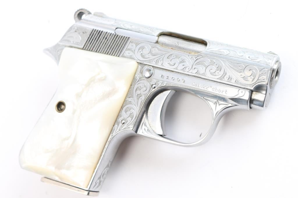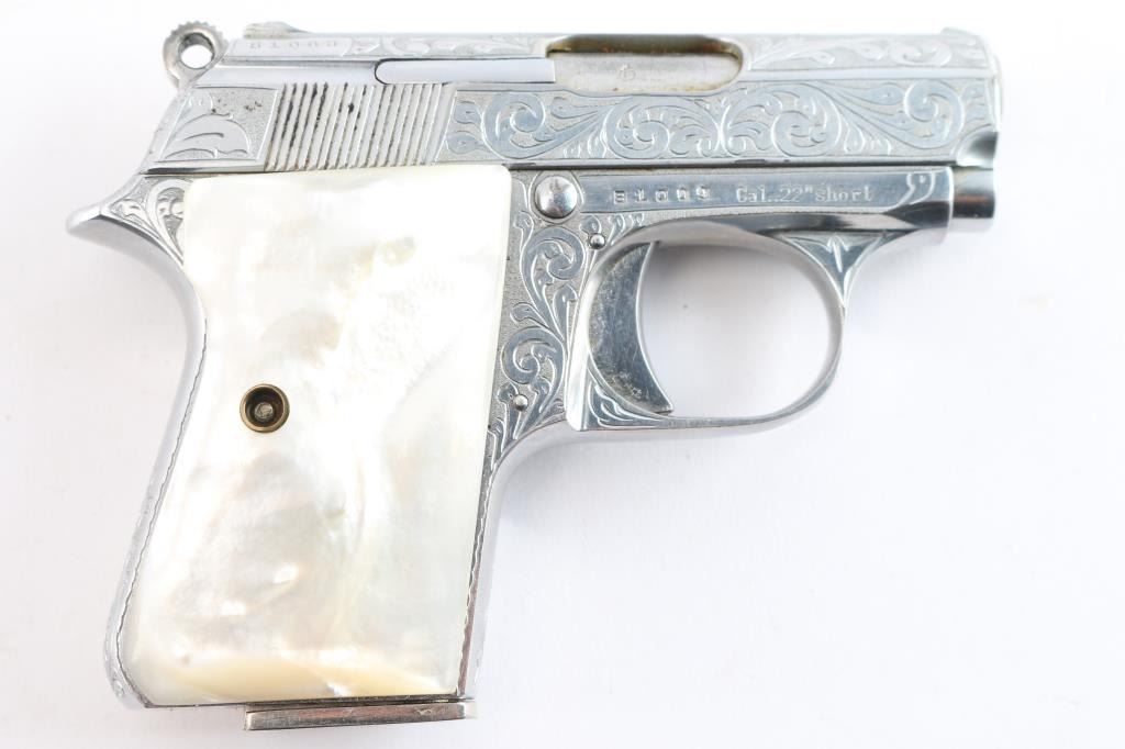 Vintage single action semi-automatic pocket pistol chambered in .22 short. Manufactured in Spain circa 1956. Features a chrome plated finish with 75% coverage scroll hand engraving, 2.25” barrel, full-length steel guide rod, fixed sights, smooth trigger, serrated round hammer spur, manual safety/slide catch on the left side of the frame, push button magazine release, 6 round magazine, steel frame and mother-of-pearl grips. Matching serial numbers are found on the frame & slide. Pistol retains approximately 93% of its original finish showing some flaking and light pitting. The action is mechanically sound, the bore is excellent, and the mother-of-pearl grips are excellent.