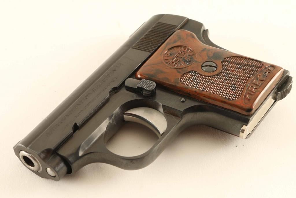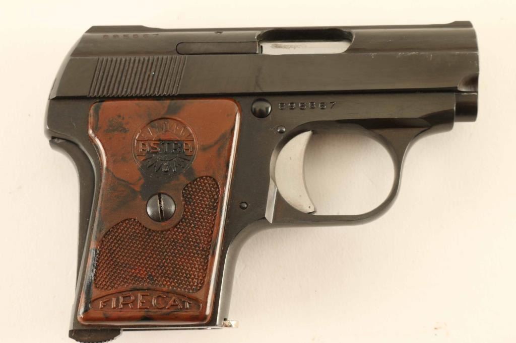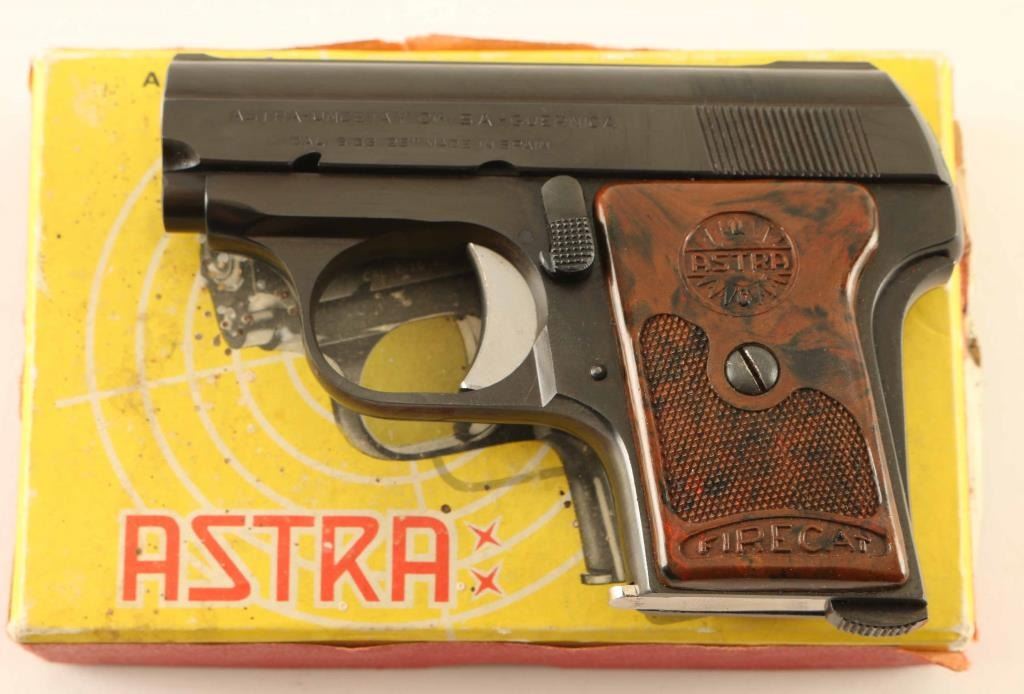 Pistol, Semi-Automatic. Made in Spain. Blued finish, with chrome barrel, and trigger. Brown plastic checkered grips. Similar to a Baby browning, Colt 1908. Ser#s match on frame and slide. Production year code "M" under right grip indicating 1941. grip, and thumb safety. 2.25" chrome barrel. Bore appears very good/bright, but dirty. Functions properly. Sights are a U channel cut in top of receiver. Metal finish is about 99% with a couple of very small scratches. grips are excellent. Chrome 6-rd Astza magazine included. Comes in the original Asta , Red & Yellow factory box, with cleaning rod. NRA Condition-Near Excellent. C&R eligible