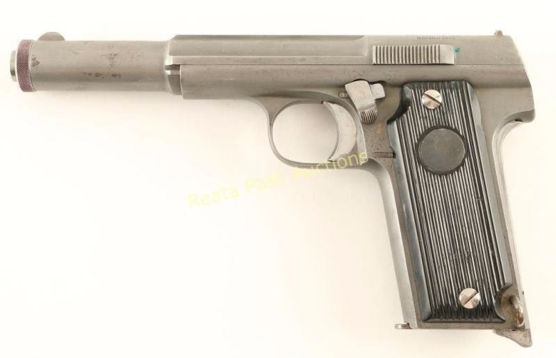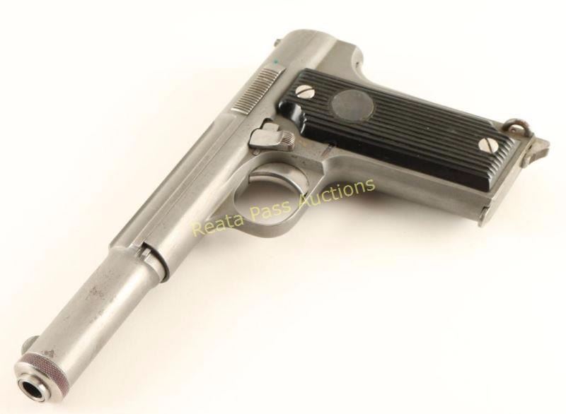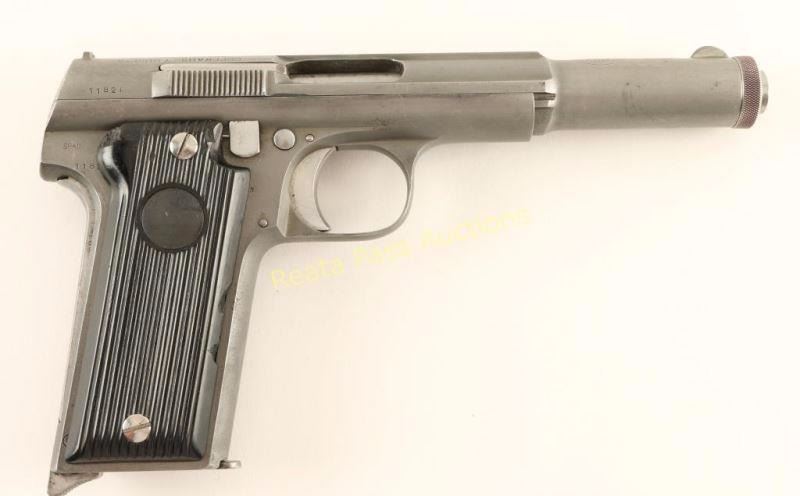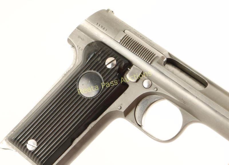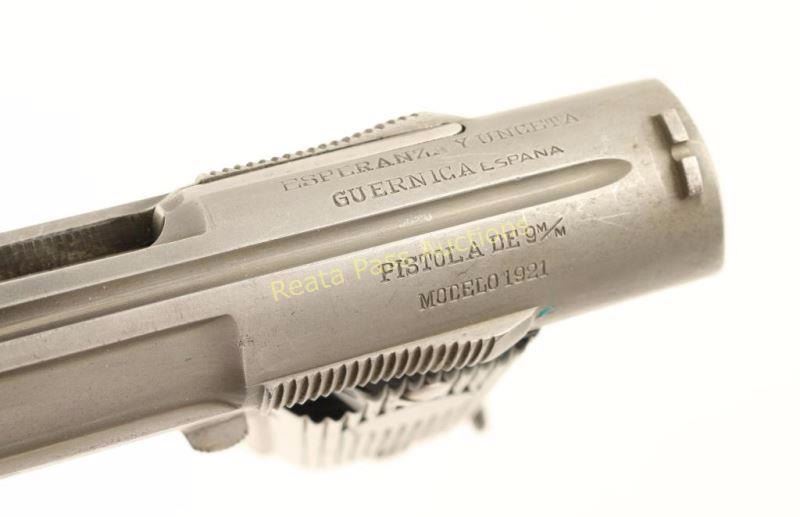 'Astra 400' Spanish Carabineros marked semi-automatic pistol chambered in 9x23mm Largo, circa 1923. Approximately 10,000 model 1921 where produced and marked for the Carabineros(Spanish Border Patrol.) Features a 6" barrel, blade front sight, notched rear window sight, bulged cocking serrations on the slide, steel frame, smooth trigger, manual safety, grip safety, 8 round magazine, lanyard loop and two-piece serrated black hard rubber grips. No import marks. Markings: Slide - "ESPERANZA Y UNCETA/GUERNIC. A ESPANA", "PISTOLA DE 9M/M/MODELO 1921". Astra star, Carabineros crown & "11821". Frame - "Spain" & "11821". The numbers "821" are stamped on the grip safety & trigger bar. Pistol has been extensively cleaned and is now in-the-white with a nice even muted silver patina. The grip safety has been drilled & tapped. Action is strong, bore is excellent and grips are good with some minor losses. Condition is good++. ***C&R Firearm*** ***Modern Firearm***
