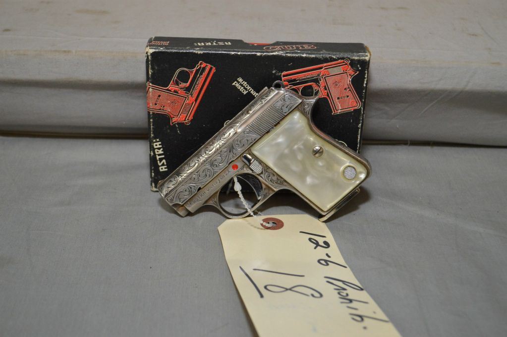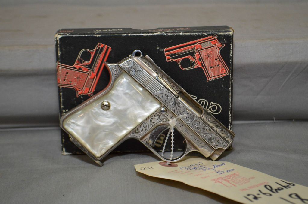 Astra Model Cub .22 Short Cal 7 Shot Semi Auto Pistol w/ 57 mm bbl [ engraved silver or chrome finish, but does have some tarnish so possibly silver, white pearl like plastic grips, in original box ] Ser # 180937 Prohib 12 - 6 Cert # 7139660