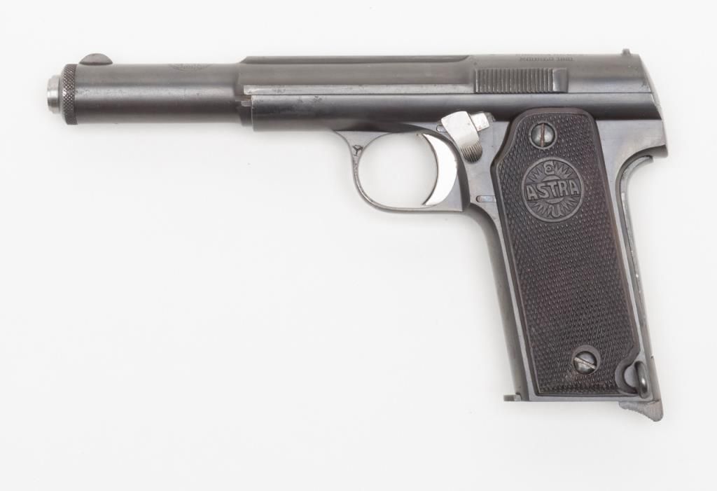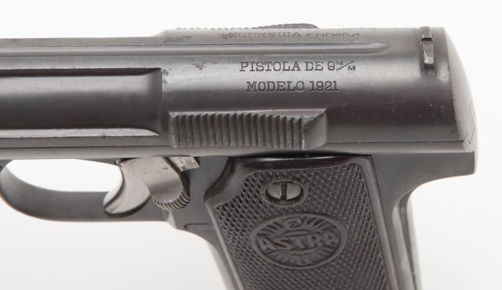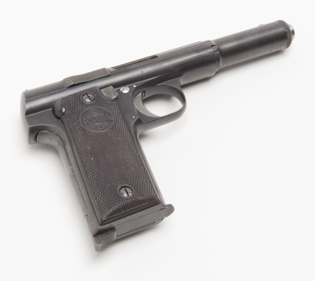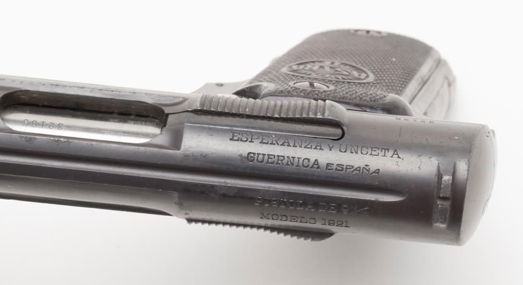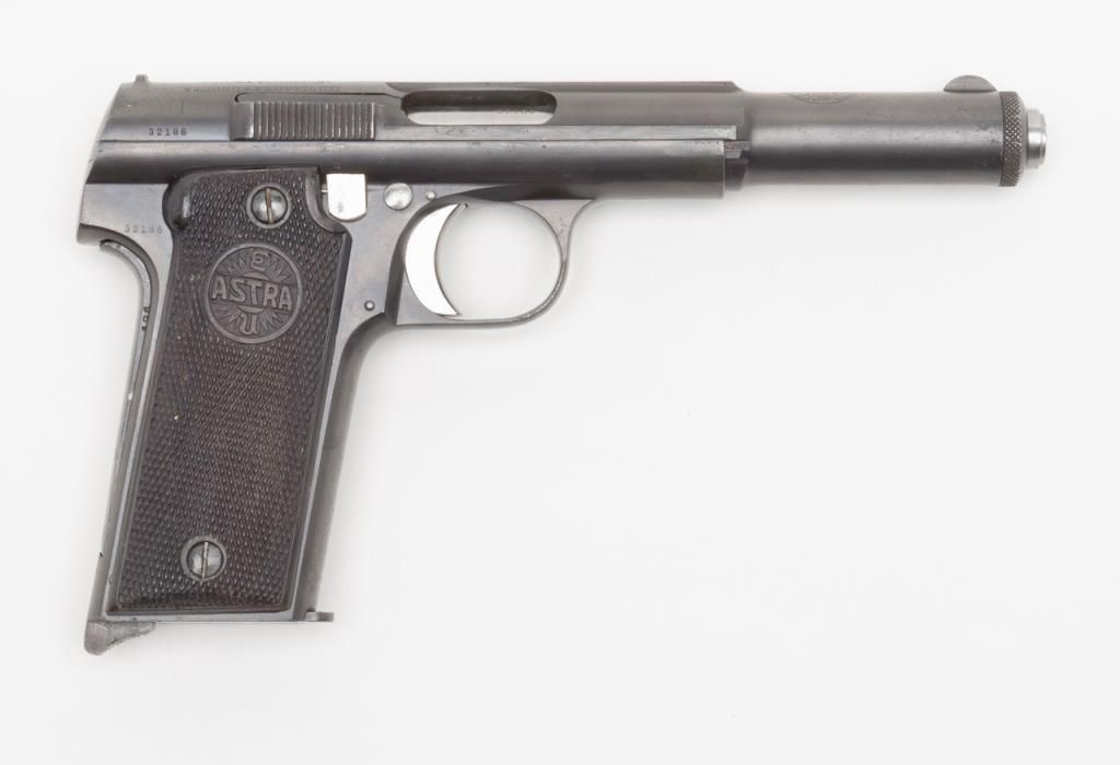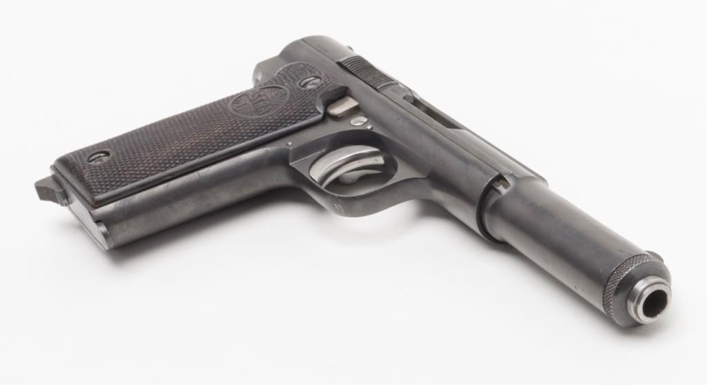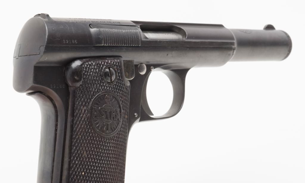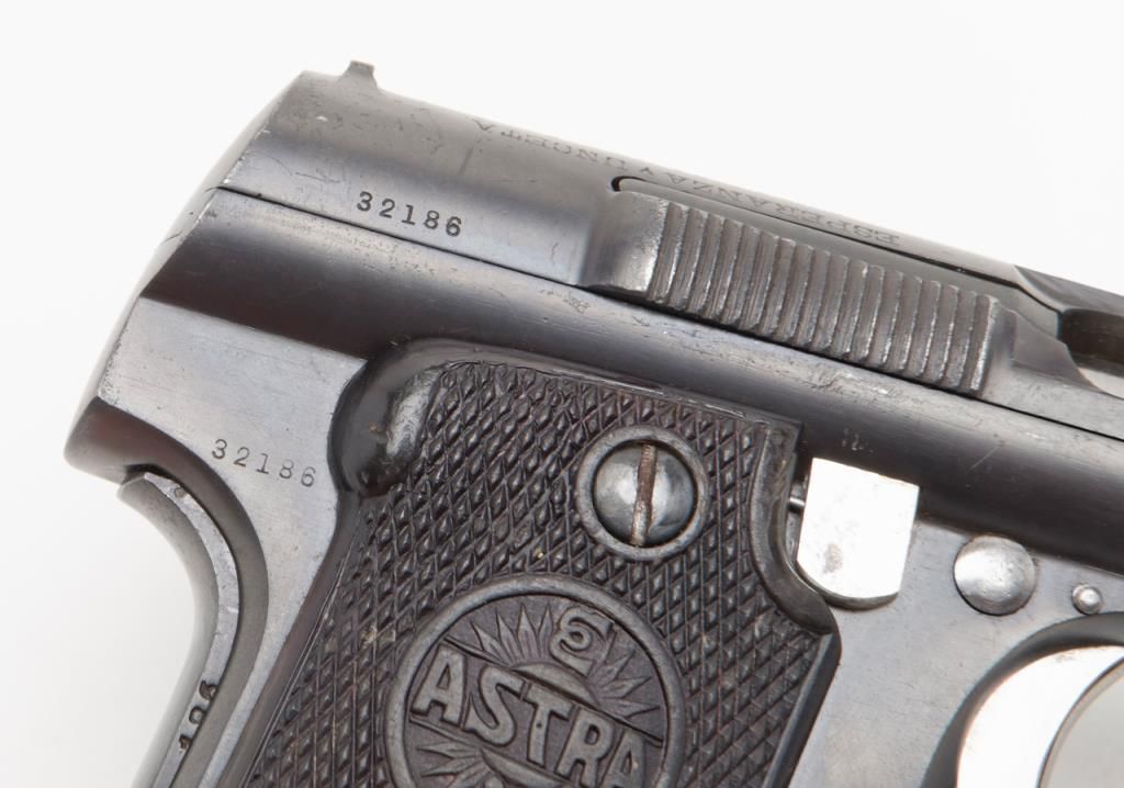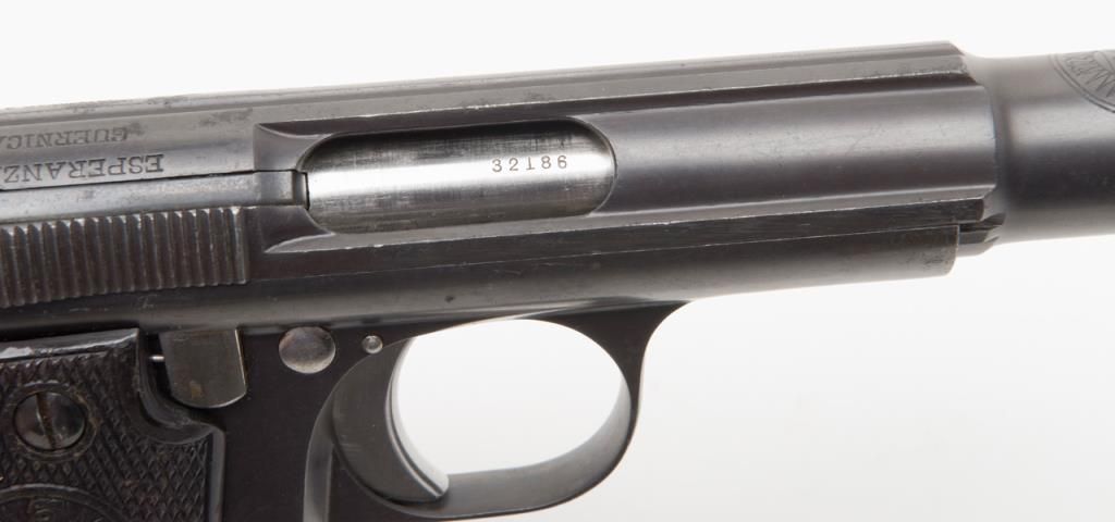 Astra Modelo 1921 semi-automatic pistol, cal. 9mm, Serial #32186. The pistol is in overall very good condition with a 5 7/8” barrel. The pistol retains nearly all of its blued finish with some loss of finish at the muzzle. The checkered hardrubber grips are in very good condition showing only small mars from use. The bore is very good, the action crisp and markings sharp. The pistol comes with one correct, Astra marked magazine. (C+R/PPT). Est.: $250-$350.