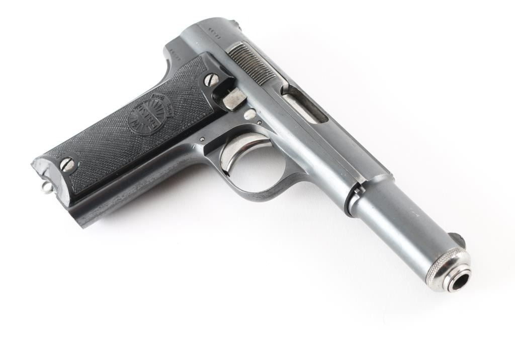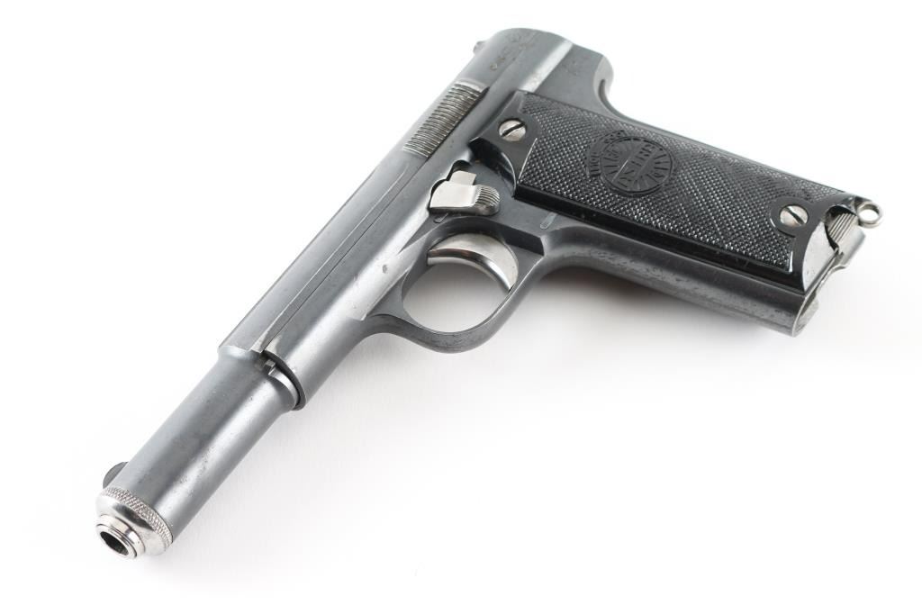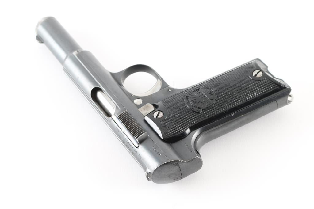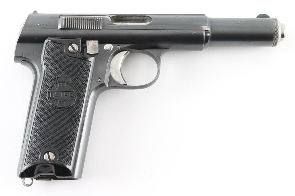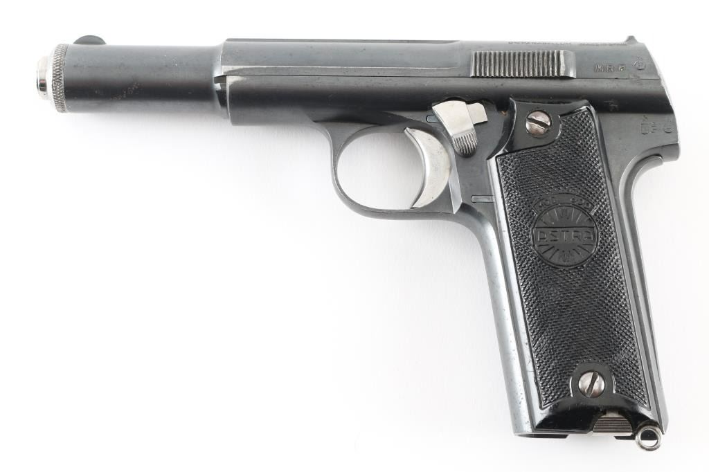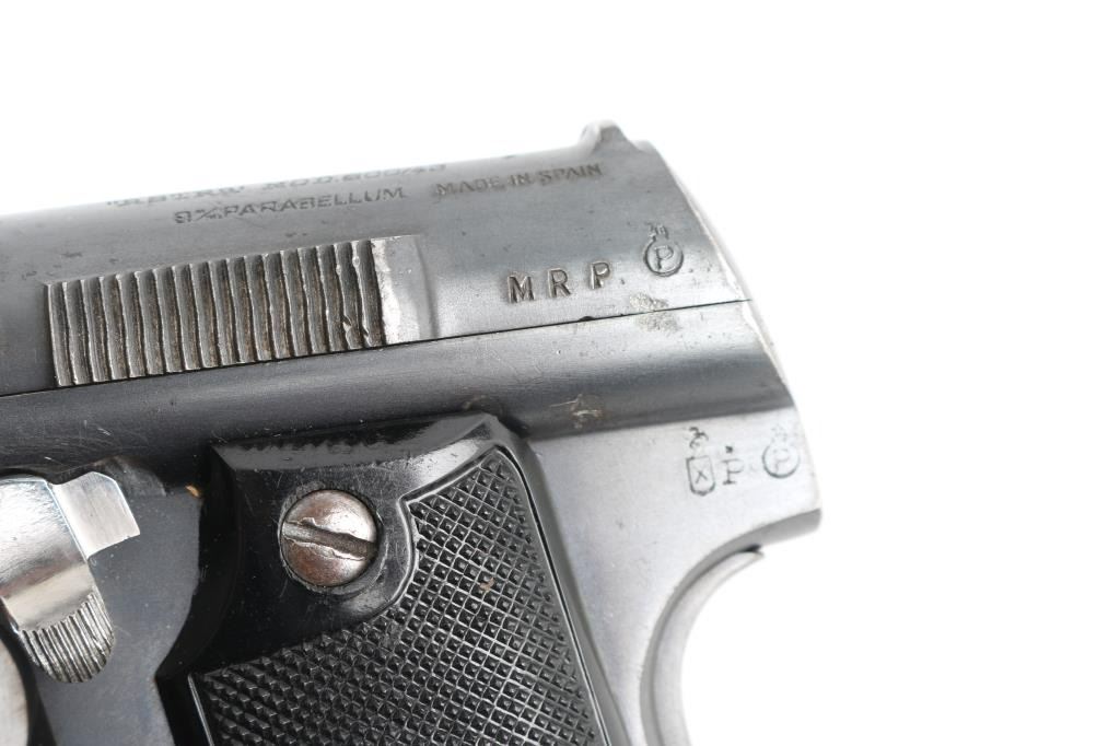 Spanish made semi-automatic pistol chambered in 9x19mm, circa 1945. This late production pistol was part of a Nazi contracted order that was never delivered, they where sold commercially after the war. (No Waffenamts) This pistol is marked "MRP", for "Marina Republic of Portugal" (Navy), with correct plastic grips. Features a blued finish, 5.36" barrel, blade front sight, notched rear window sight, steel frame, smooth trigger, thumb safety, grip safety, push button magazine release, lanyard loop, and two-piece checkered black plastic "Astra" grips. No import marks. Markings: Slide - UNCETA Y COMPANIA S.A./GUERNICA ESPANA", ""ASTRA" MOD.600/43/9M/M/ PARABELLUM", & "54429"., and "Made in Spain" And M R P. Frame - knights head/"X" inside a shield, star/"P", "P" inside a circle. No magazine. Pistol exhibits approximately 80% of what appears to be it's original blued finish showing moderate holster wear, minor pin-prick pitting on the fore strap, and some handling marks. Action is sound, bore is excellent and grips are very good. NRA Condition is very good as C&R Firearm