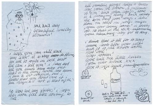 In this final page of a letter to Stuart’s mother, the fact that Astrid is recounting some of the songs the Beatles were performing dates this letter between late April and late May 1962. Only three days after Stuart Sutcliffe’s death on April 10th, The Beatles returned to Hamburg for a seven-week engagement at the recently opened Star Club. Astrid relates: “...tell Pauline George sings...’A Picture of You’ and John sings ‘Love Is A Swinging Thing’ and ‘Money’...both very good songs I like them...On another one George sings ‘open your loving arms’...so that’s the rock-information from Hamburg today...love and three little kisses from your Astrid...” Inside the drawing of a heart, she has written “Astrid loves Stuart forever.” In a page from another letter written at a different time, Astrid has drawn a self-portrait of her in bed with flowers on the bedside table and writes: “...me and my smelly flowers!...I hope you can still read my letter. It is very difficult for me to write in bed...So how are my sisters? (referring to Stuart’s sisters, Pauline and Joyce) I hope they soon feel like writing to me.” Written on blue stationary paper (8.25 x 11.75”) in black fountain pen, multiple mailing folds, light wrinkles.