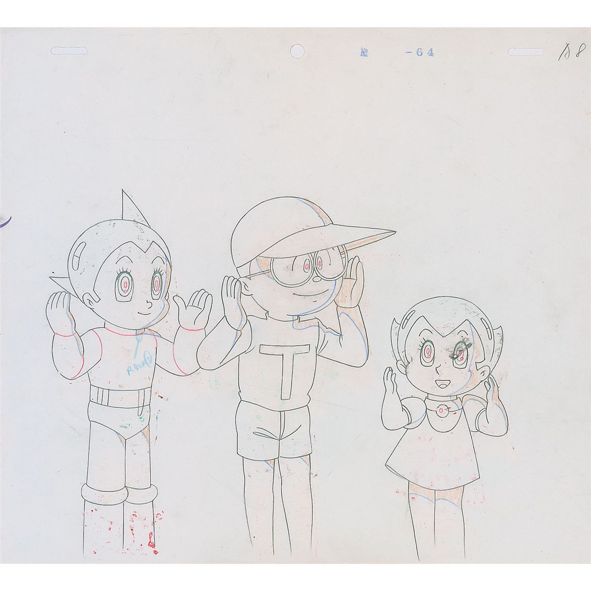 (Tezuka Productions, 2003) Original production cel featuring Astro Boy and Uran (Astro Girl) from the Astro Boy television series. Astro Boy’s image measures 3 x 6, Uran measures 2.25 x 4, and the image of the young boy in the middle measures 3.5 x 6, with overall dimensions of 10.5 x 9. Corresponding colored pencil production drawing of the trio is on a 10.5 x 9.5 animation sheet. In fine condition.