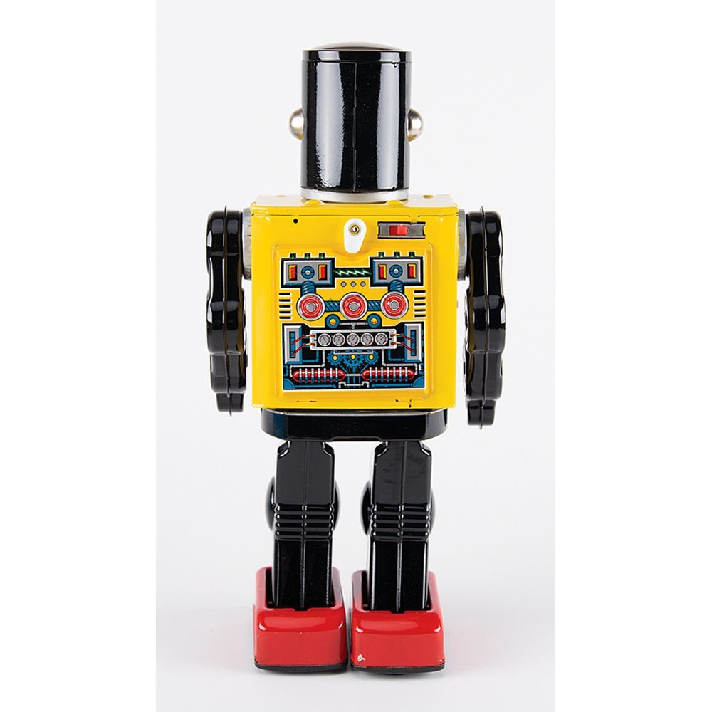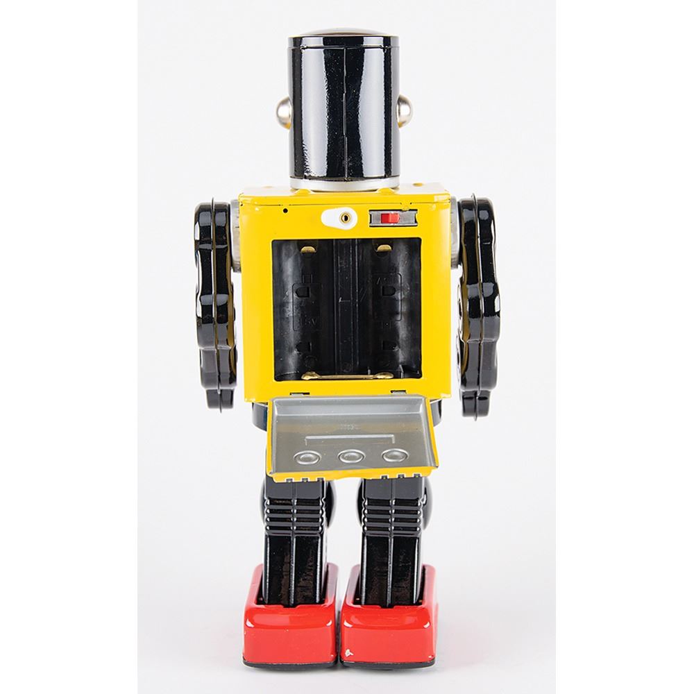 Desirable circa 2000s battery-operated "Astro-One" walking tin toy robot, made in Japan by Metal House, standing at 12Àù tall. The stylish, vintage-inspired robot has a black, yellow, and red body with classic lithographed designs. After a few steps it stops, the chest doors open, and guns pop out and flash while the torso spins. Includes its original box.