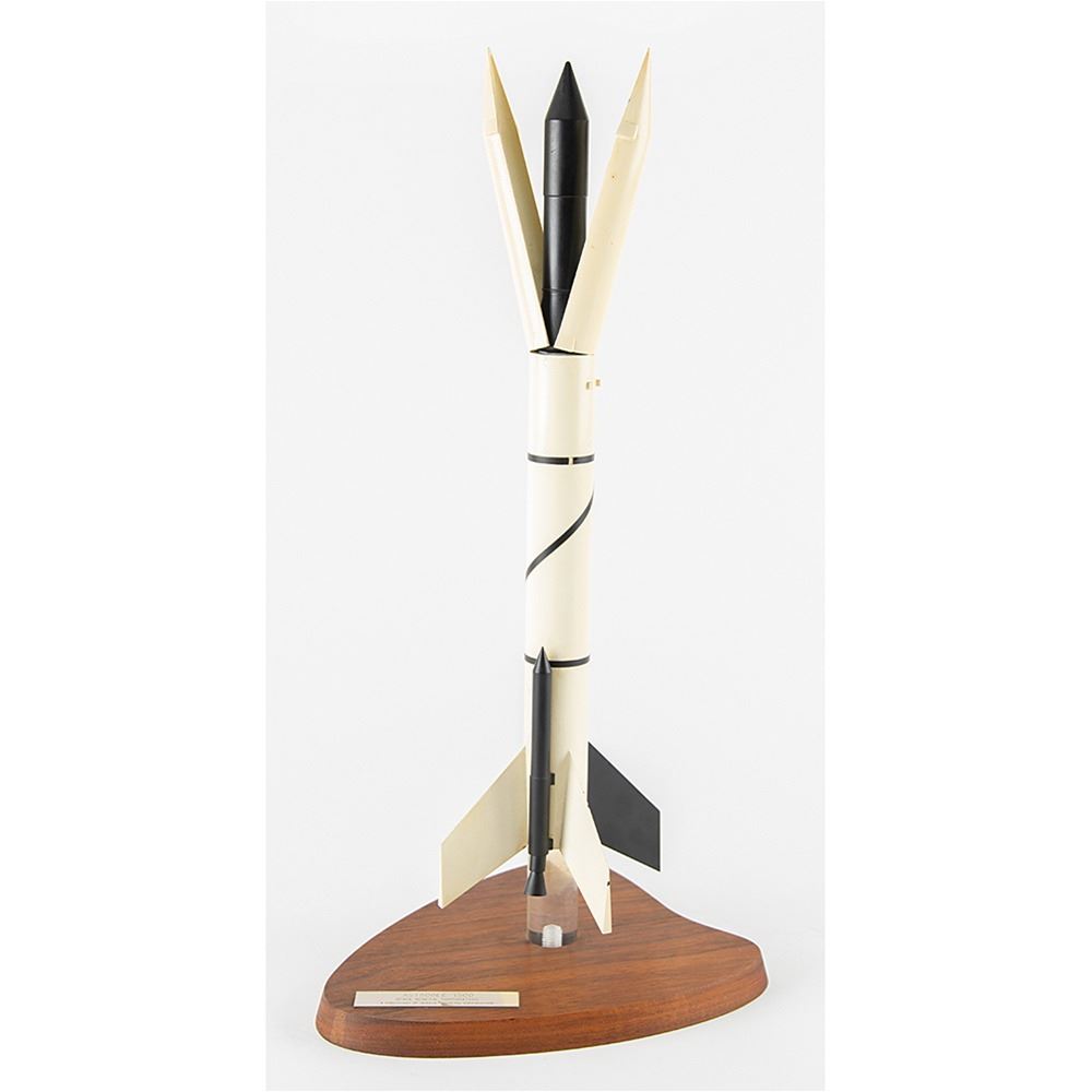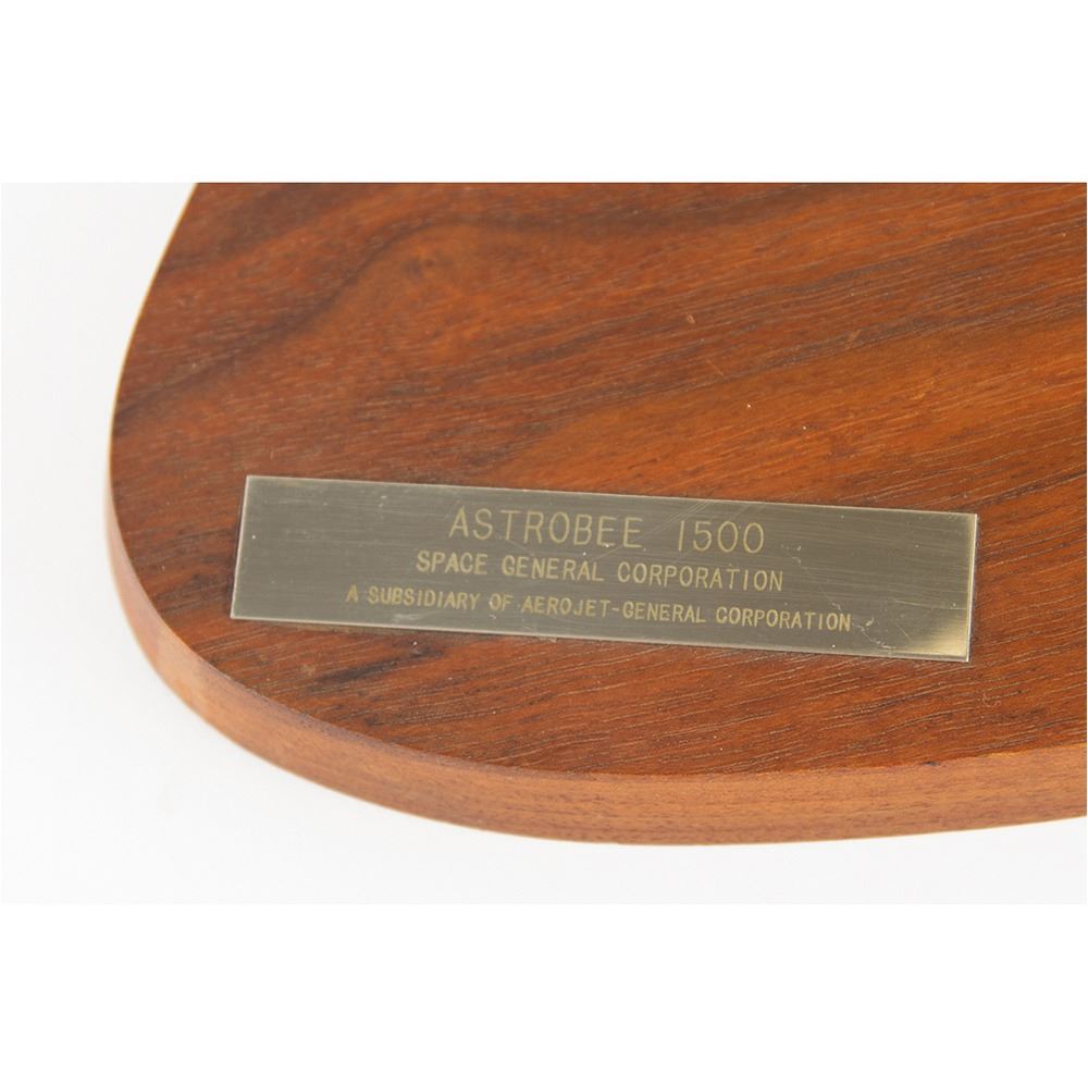 Appealing 1:24 scale model of the Astrobee 1500 three-stage sounding rocket, measuring 16Ë tall, set upon an attractive wooden base with engraved plaque: "Astrobee 1500, Space General Corporation, A Subsidiary of Aerojet-General Corporation." Fabricated almost entirely from metal, the model portrays the rocket with its nose cone open. In fine condition. A handsome display piece.