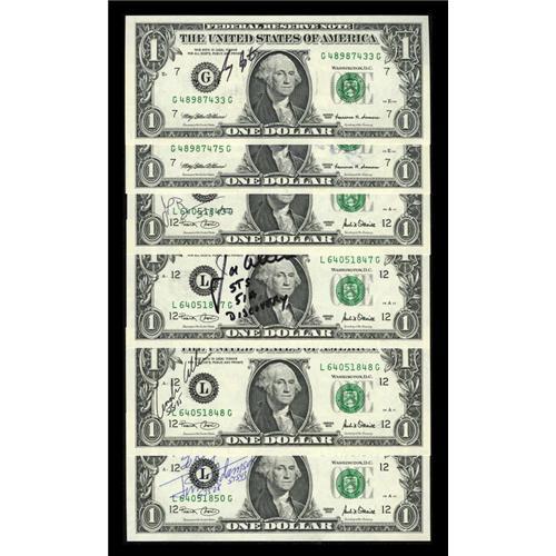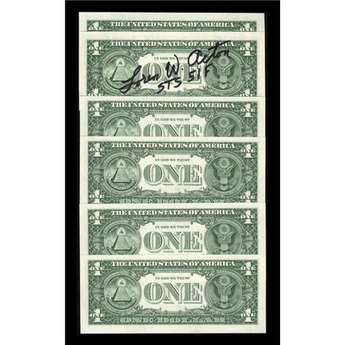 <B>Astronaut Autographed Paper Money.</B></I><BR> These astronauts autographed the following $1 FRNs from 1999 - 2001, Loren W. Acton, Jim Adamson (personalized), Andrew Allen, Jon Allen, "Jay" Apt, and James P. Bagian. <B>Gem Crisp Uncirculated. </B></I><BR><BR><b>Shipping:</b> Coins & Currency (<a target="_blank" href="http://www.heritageauctions.com/common/shipping.php">view shipping information</a>)