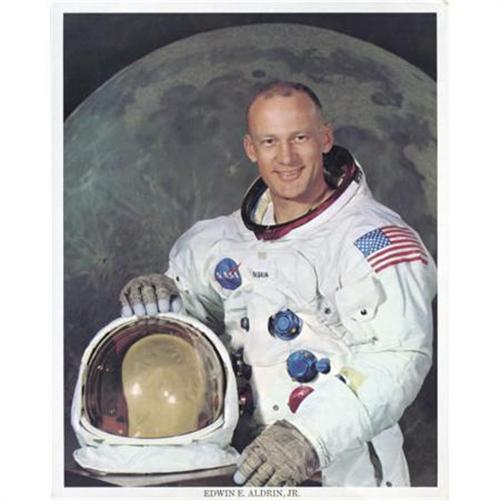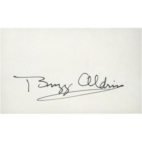 <B>Astronaut Buzz Aldrin Signed Card with Color Photograph.</B></I> Official NASA photograph 8" x 10" shows Aldrin wearing his space suit against a lunar backdrop, with brief biography on reverse; signed card 5" x 3", <I>"Buzz </B></I>Aldrin". In very good condition.<BR><BR><b>Shipping:</b> Flat Material, Small (<a target="_blank" href="http://www.heritageauctions.com/common/shipping.php">view shipping information</a>)