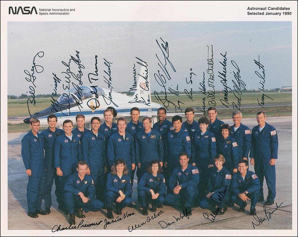 Color 10 x 8 NASA photo of the NASA astronaut candidates selected in January 1990, signed in black felt tip by 22 of the honorees: Charles Precourt, Janice Voss, Ellen Ochoa, David Wolf, Eileen Collins, Dan Bursch, Carl Walz, Don Thomas, Ken Cockrell, Leroy Chiao, Susan Helms, Nancy Sherlock, William Gregory, Peter Wisoff, Rick Searfoss, James Halsell, James Newman, Bernard Harris, Ronald Sega, William McArthur, Michael Clifford, and Terry Wilcutt. In fine condition.