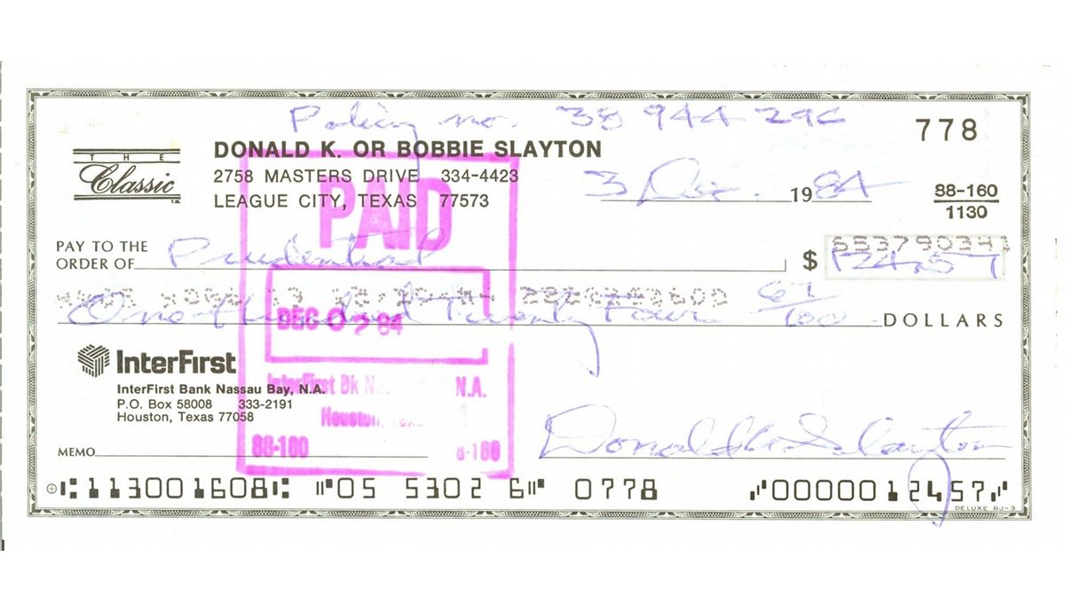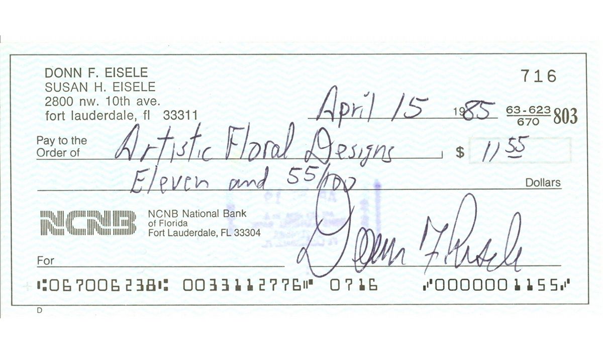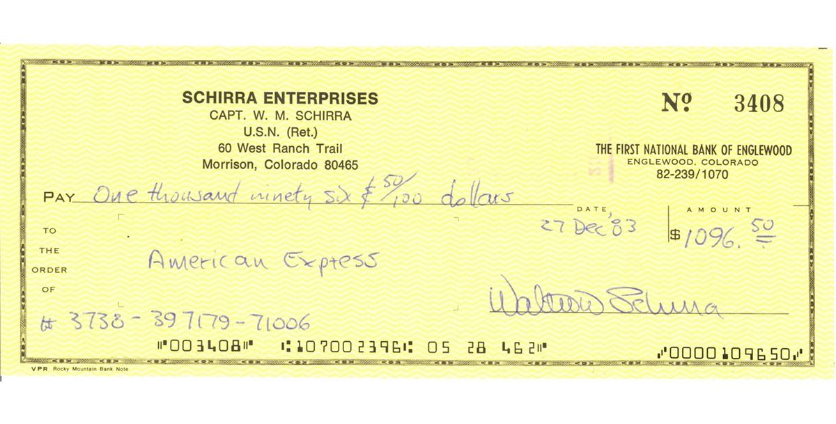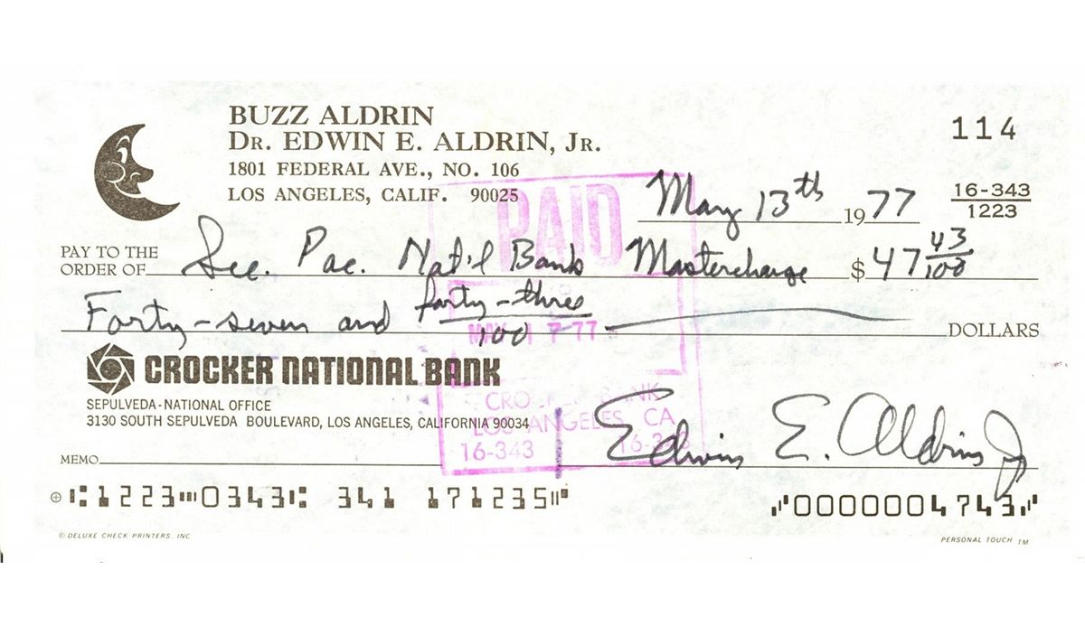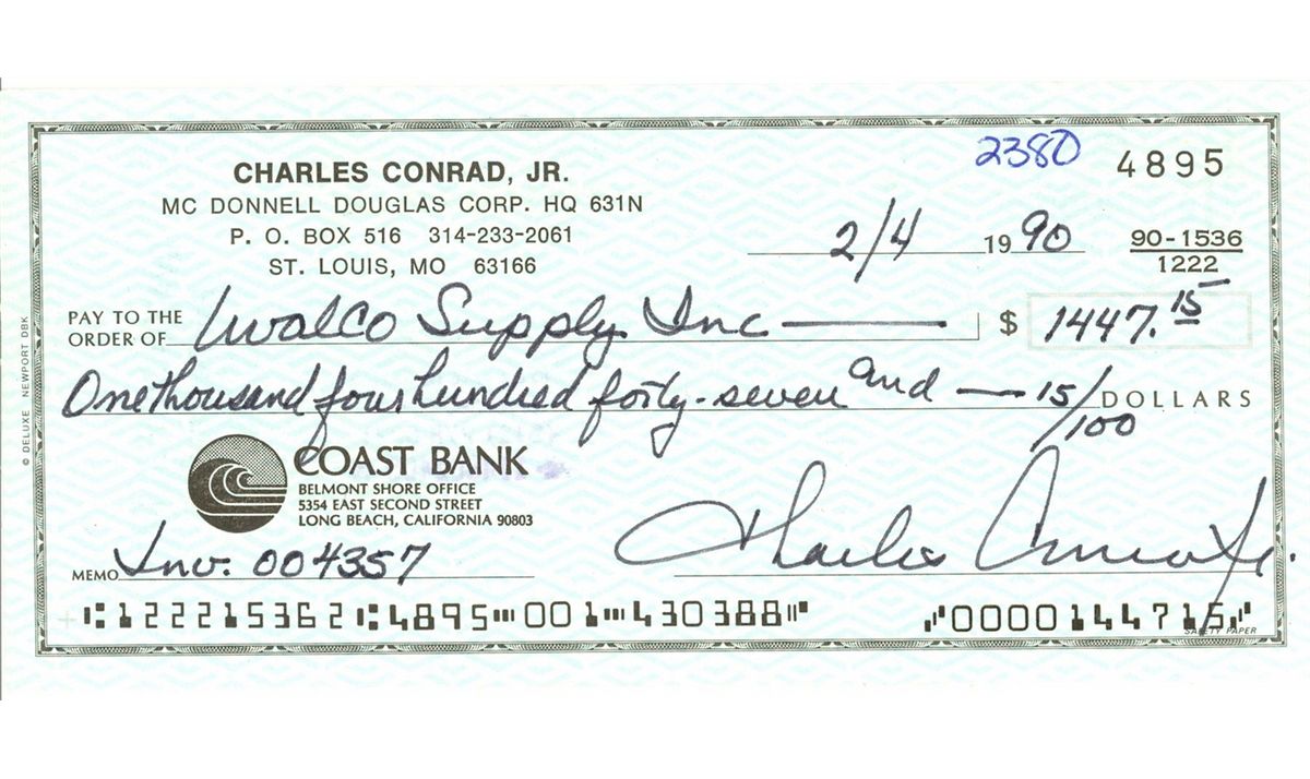 A Collection of 6 signed and handwritten checks by astronauts. Donn Eisele (Apollo 7) Walter Schirra (Apollo 7) Charles Conrad (Apollo 12) Donald Slayton (Apollo–Soyuz) James Irwin (Apollo 15) Buzz Aldrin (Apollo 11). All in fine Condition.