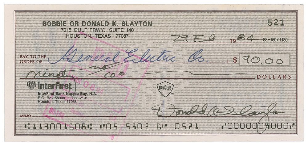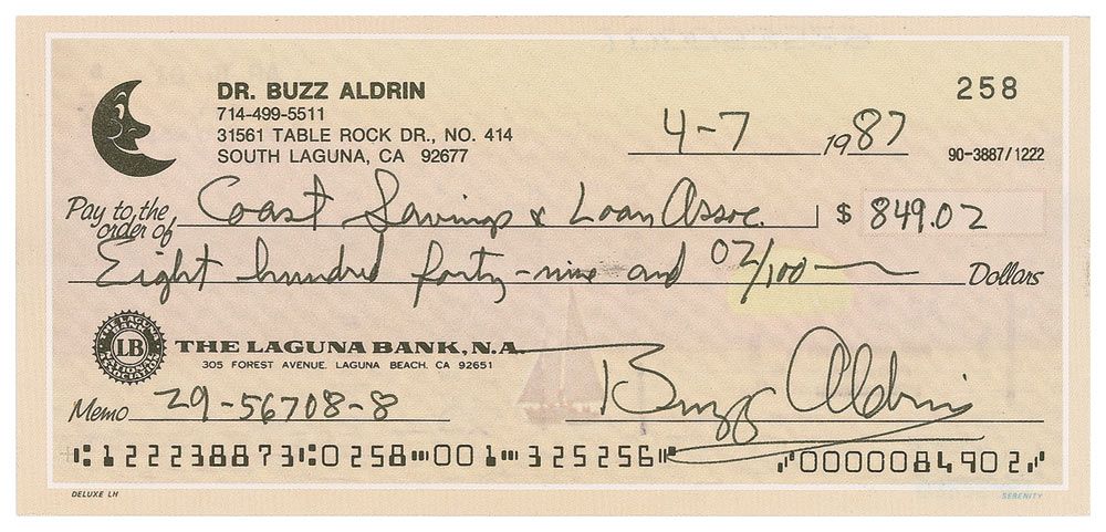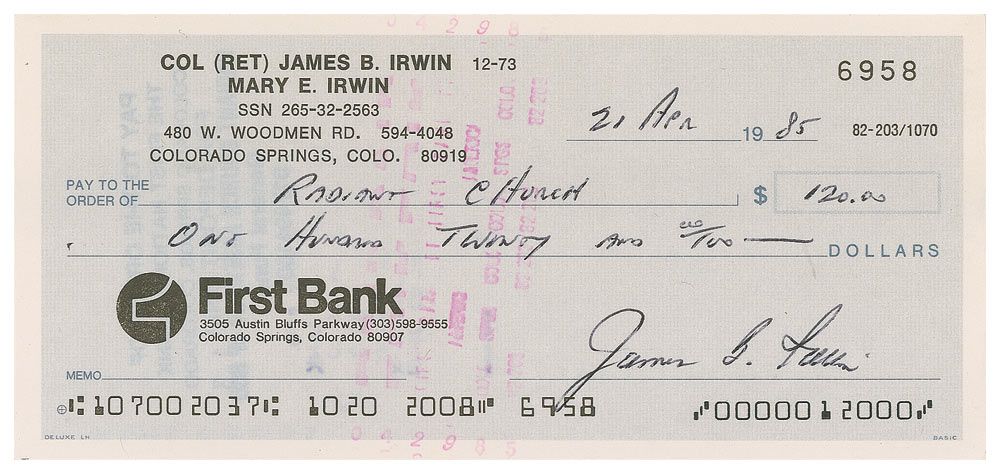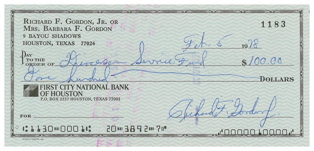 Four personal checks, all approximately 6 x 2.75, ranging in date from 1978 to 1987: check filled out and signed by Buzz Aldrin; check filled out and signed by Dick Gordon, “Richard F. Gordon, Jr.”; check filled out and signed by Jim Irwin, “James B. Irwin”; and a check partially filled out and signed by Deke Slayton, “Donald K. Slayton.” In fine condition, with mild show-through from stamps on reverse, none affecting the clean signature areas.